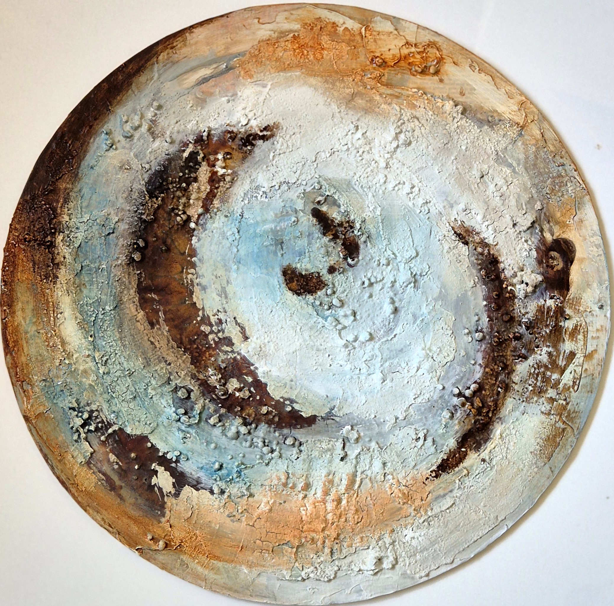 Een rond paneel met daarop veel structuur. Geinspireerd door structuren uit de natuur. .