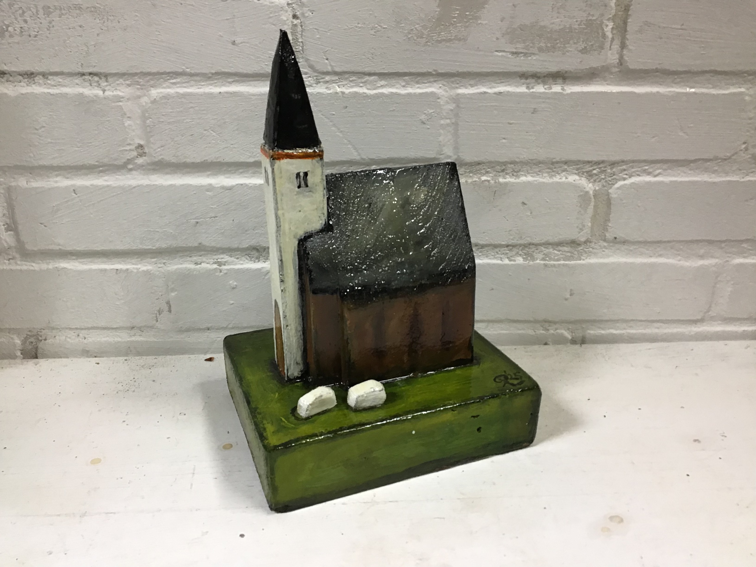 Nieuw Texels driedimensionaal werk. Eenvoud torent boven alles uit. Hoornder kerk inclusief schapen. Formaat 18 x 15 x 14 cm. VERKOCHT.