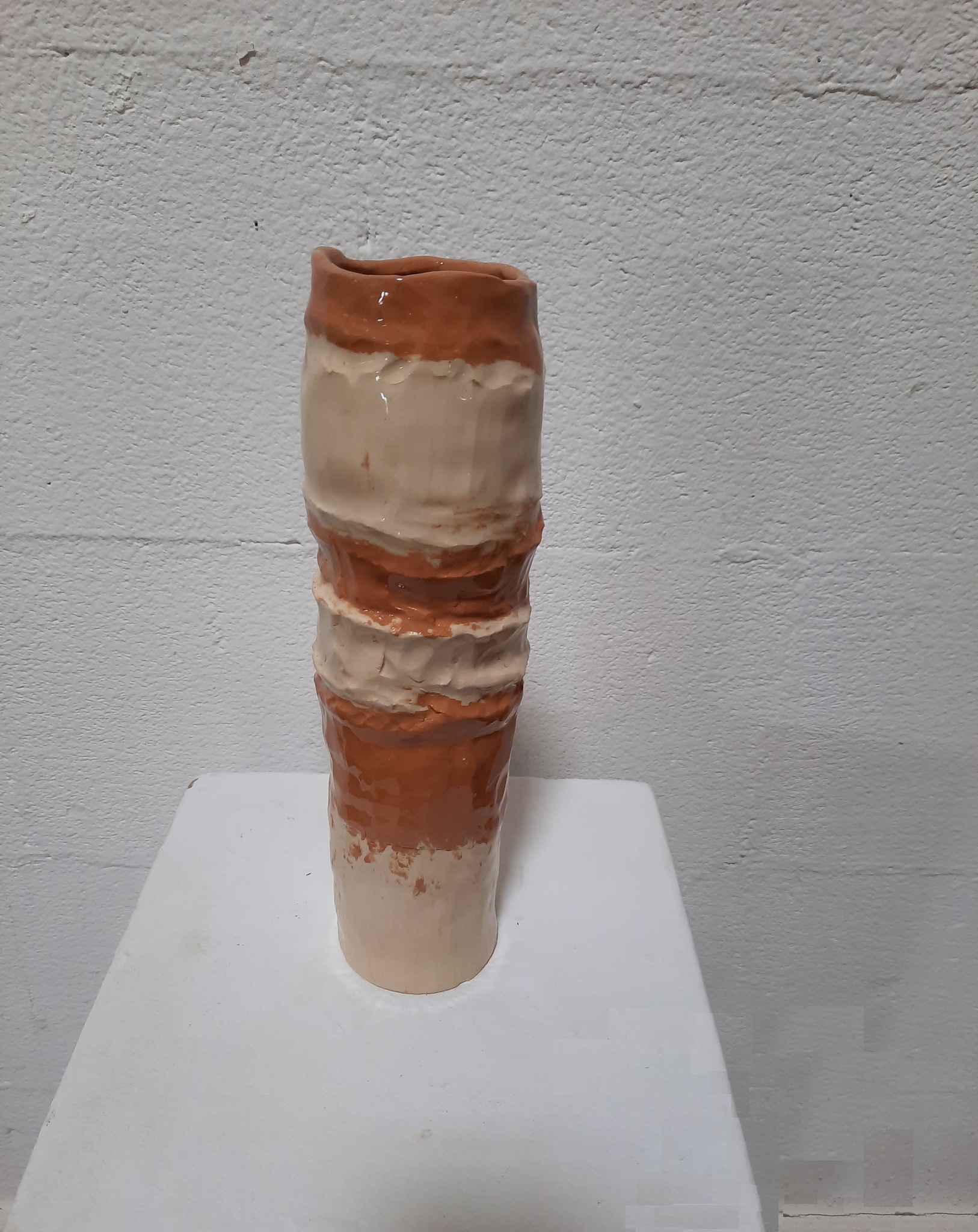 100-Vazen-project – Aardewerk, geglazuurd - proces onderzoek - Alle vazen zijn handgevormd, opgebouwd uit ringen. De vazen zijn cilindervormig en minimaal 30 cm hoog. De vazen lijken elk een eigen karakter te hebben. Hoe verhouden ze zich tot elkaar en tot de ruimte waar ze staan?