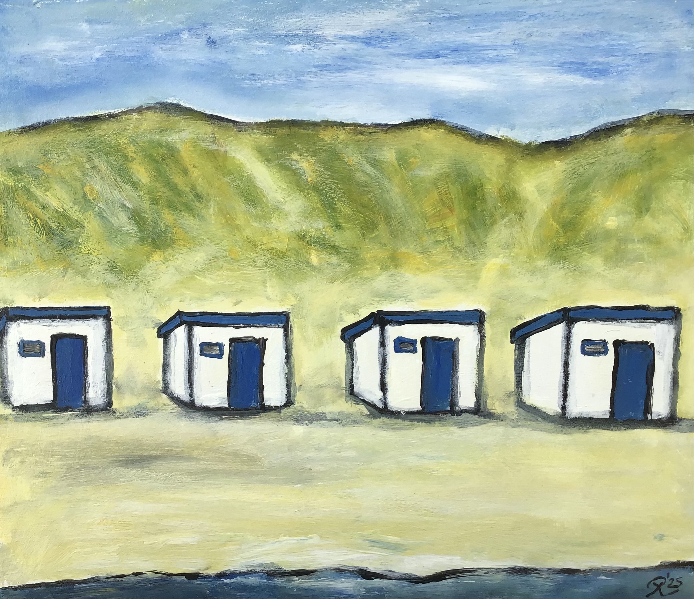 Het eenvoudige ritme van de Texelse strandhokjes bij Paal 9. Blauw en wit vullen elkaar mooi aan. Aflopend beeld, geen lijst. Zijkanten lichtblauw geschilderd. Formaat 34 x 40 x 2 cm.