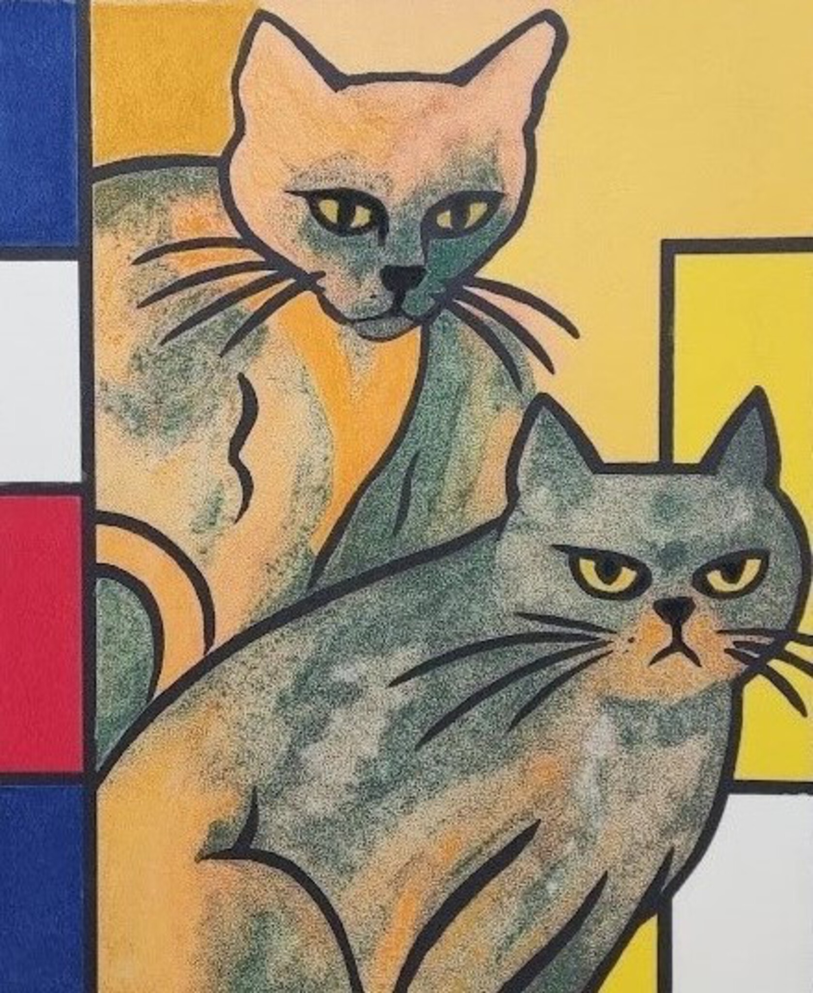 Een levendig pastel waarin twee katten zelfverzekerd poseren tegen een achtergrond van Mondriaan-achtige kleurvlakken in rood, geel, blauw en wit. De strakke geometrie contrasteert mooi met de zachte, organische vormen van de katten. Hun expressieve blikken geven het werk karakter en humor, terwijl de felle kleuren het geheel kracht en speelsheid verlenen. Een combinatie van modernistische stijl en dierlijke elegantie.