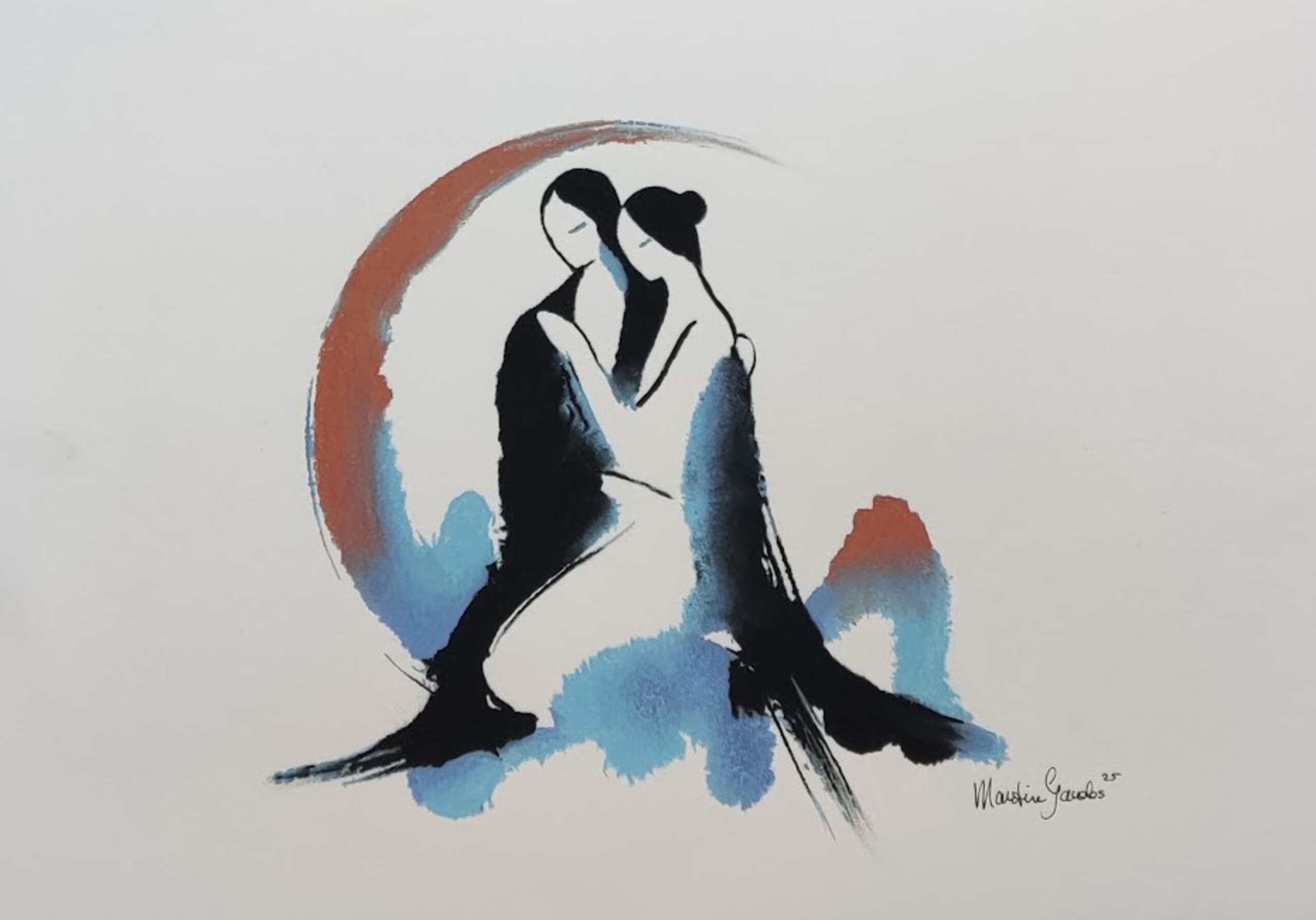 Deze print, ontworpen en ingekleurd door Martine Jacobs, toont twee elegante figuren in een zachte omhelzing, omringd door vloeiende tinten blauw en roodbruin. De minimalistische lijnen en subtiele kleuren stralen intimiteit en harmonie uit. Een sierlijk en poëtisch werk.