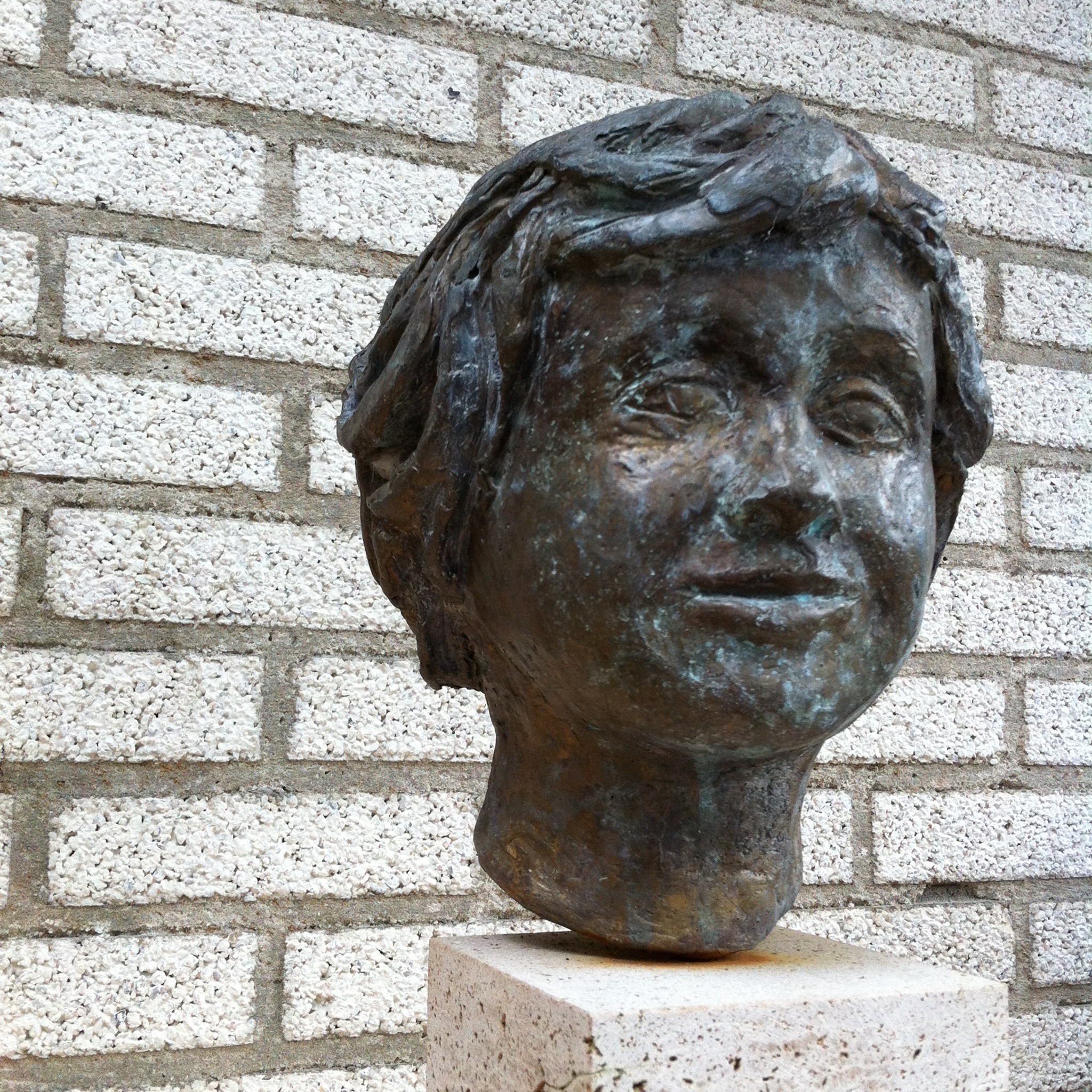 In opdracht heb ik drie portretjes mogen beeldhouwen in Belgisch hardsteen. Dit is Rutger. Ter voorbereiding heb ik lessen gevolgd bij Frank van der Loo en de drie portretjes eerst in was gemaakt en laten afgieten in brons. De stenen beelden staan op het terras bij de opdrachtgever, de bronzen heb ik zelf gehouden. De sokkel is van travertin steen. De prijs is inclusief de sokkel.