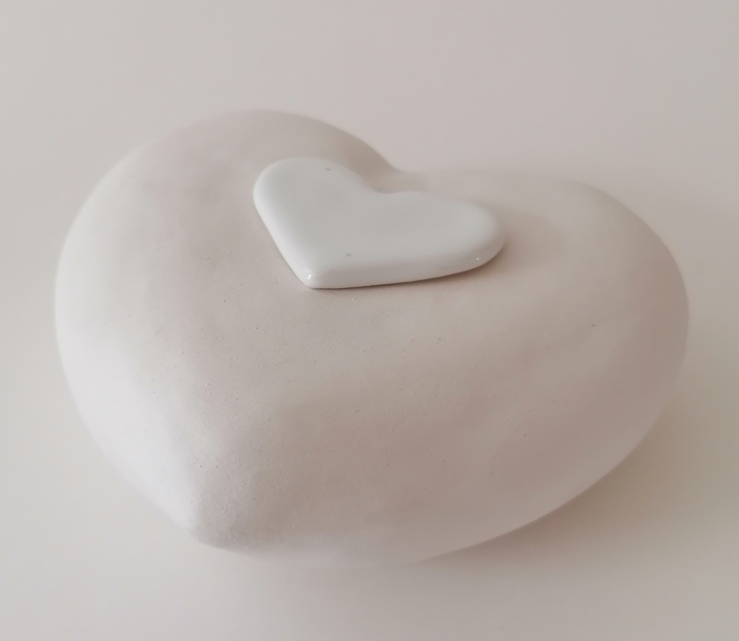 Deze mini urn is handgemaakt van keramiek. Het grote hart heeft een matte uitstraling en het kleine hartje, dat tevens de deksel is, heeft een hoogglans glazuur. De deksel kan na het vullen worden vastgelijmd. De inhoud van deze urn is 450 gram. De urn is alleen voor binnen gebruik geschikt.