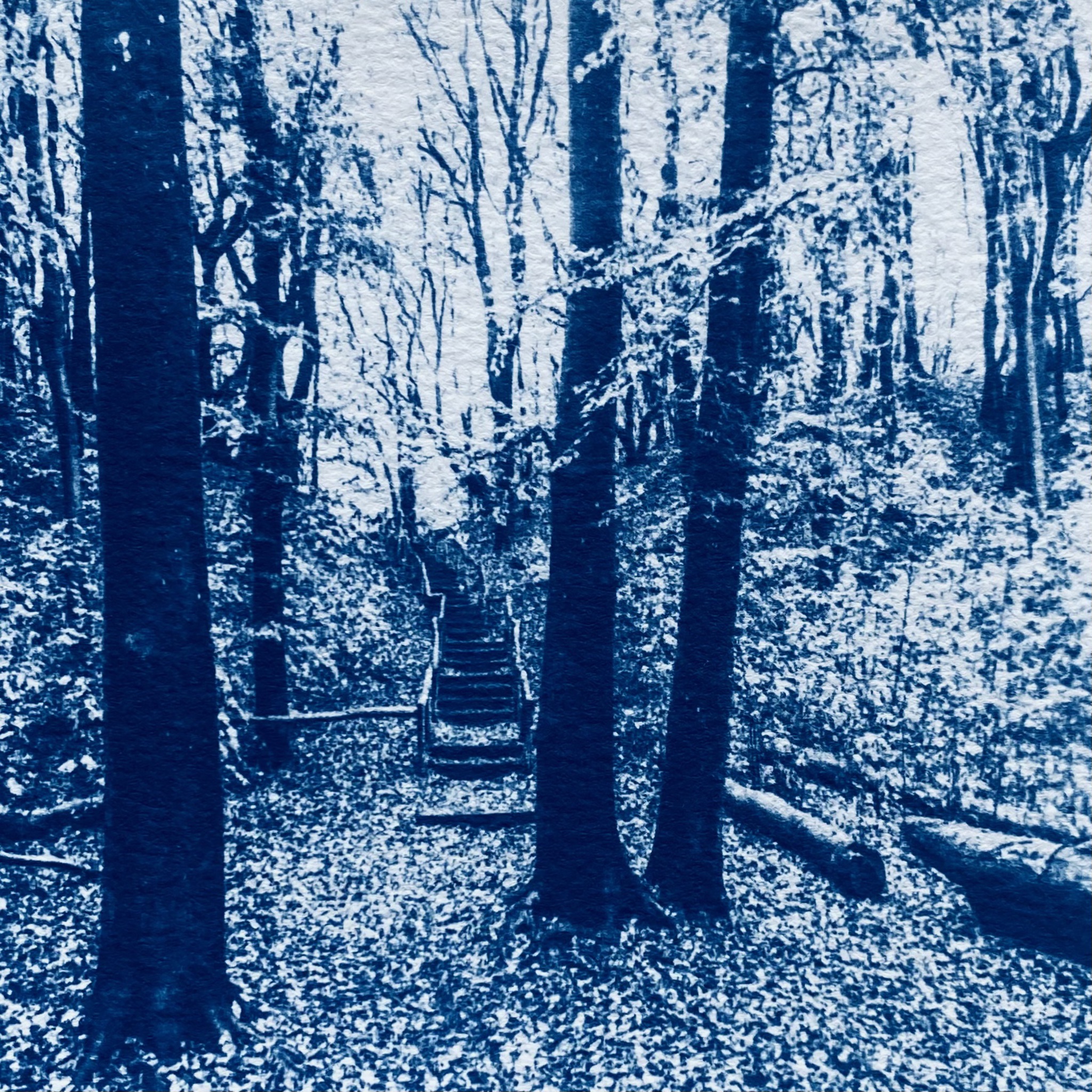 Uit de reeks Bergens Blauw, een serie unieke fotogrammen in Cyanotype techniek. De fotogrammen zijn gemaakt op 300 grams aquarelpapier en zitten in een klein houten bak lijstje. Afmeting inclusief lijst.