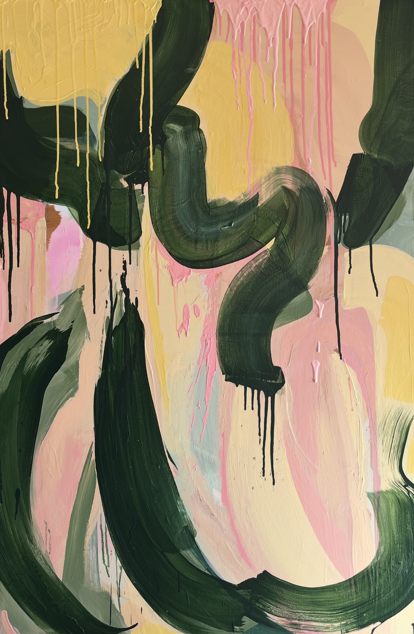 Roze, geel en groen. Een fijne combinatie met, voor mij, een sterke associatie met een geurig boeket verse bloemen. De verf mag hier daar druipen om een organisch effect te vergroten