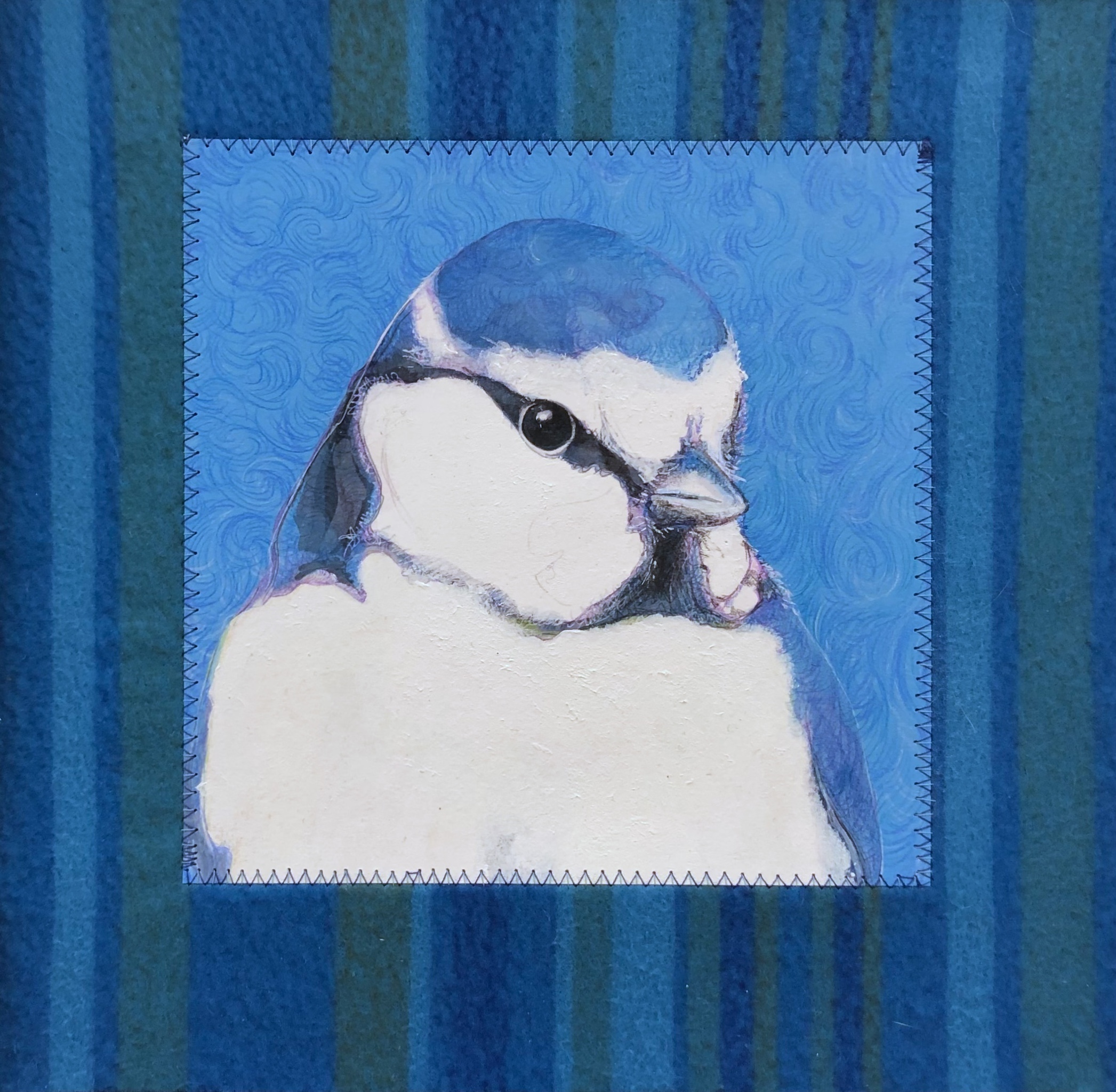 De winterkoning staat spiritueel symbool voor kracht in het klein, creativiteit en moed om je stem te laten horen. De tekening is een gelaagde gemengde techniek, voorzien van een genaaide, zachte passe‑partout van stof en omlijst met een nachtblauwe baklijst.
