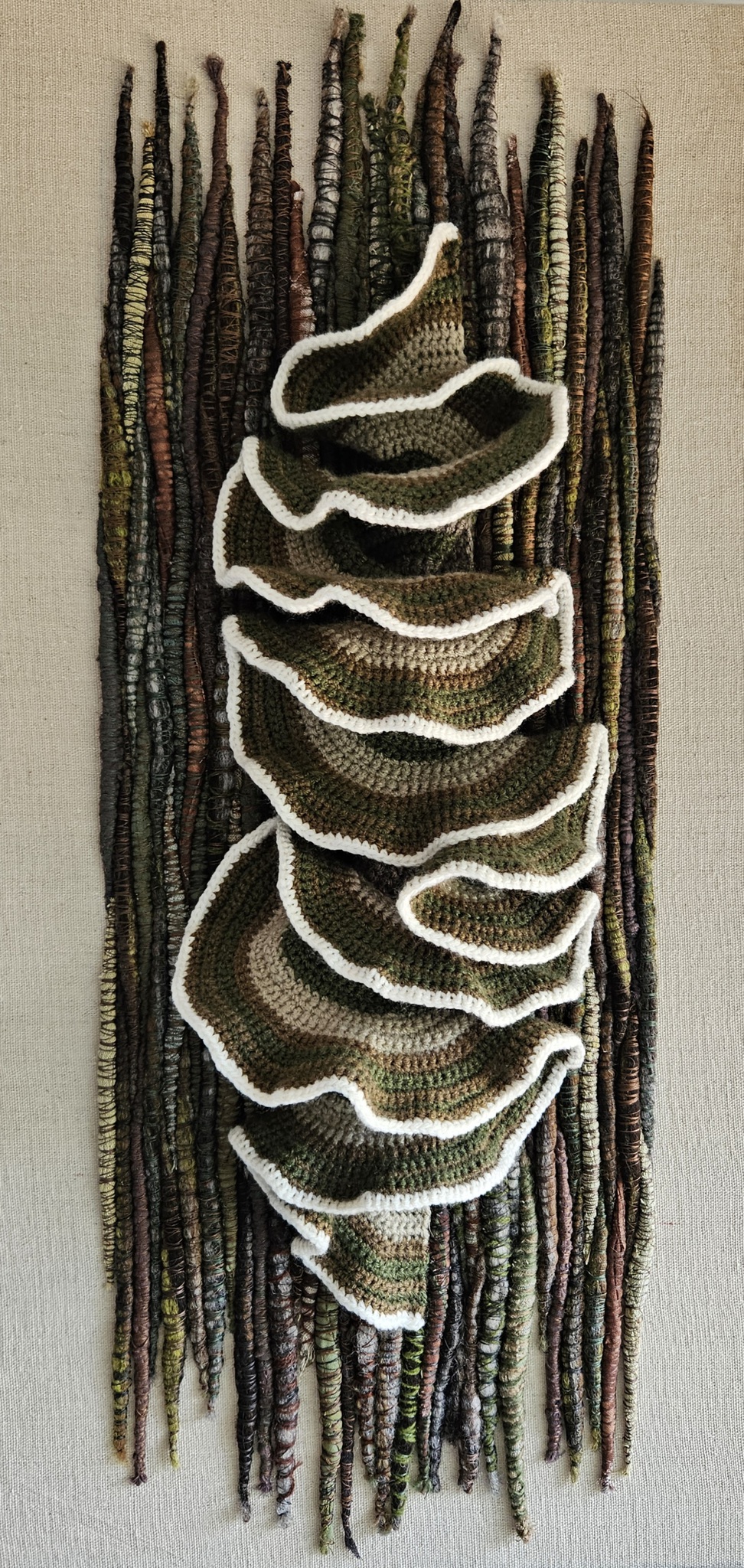 Op met linnen bekleed canvas vormen samengebonden restjes stof en ruwe wol de schors. De zwam is gehaakt.
