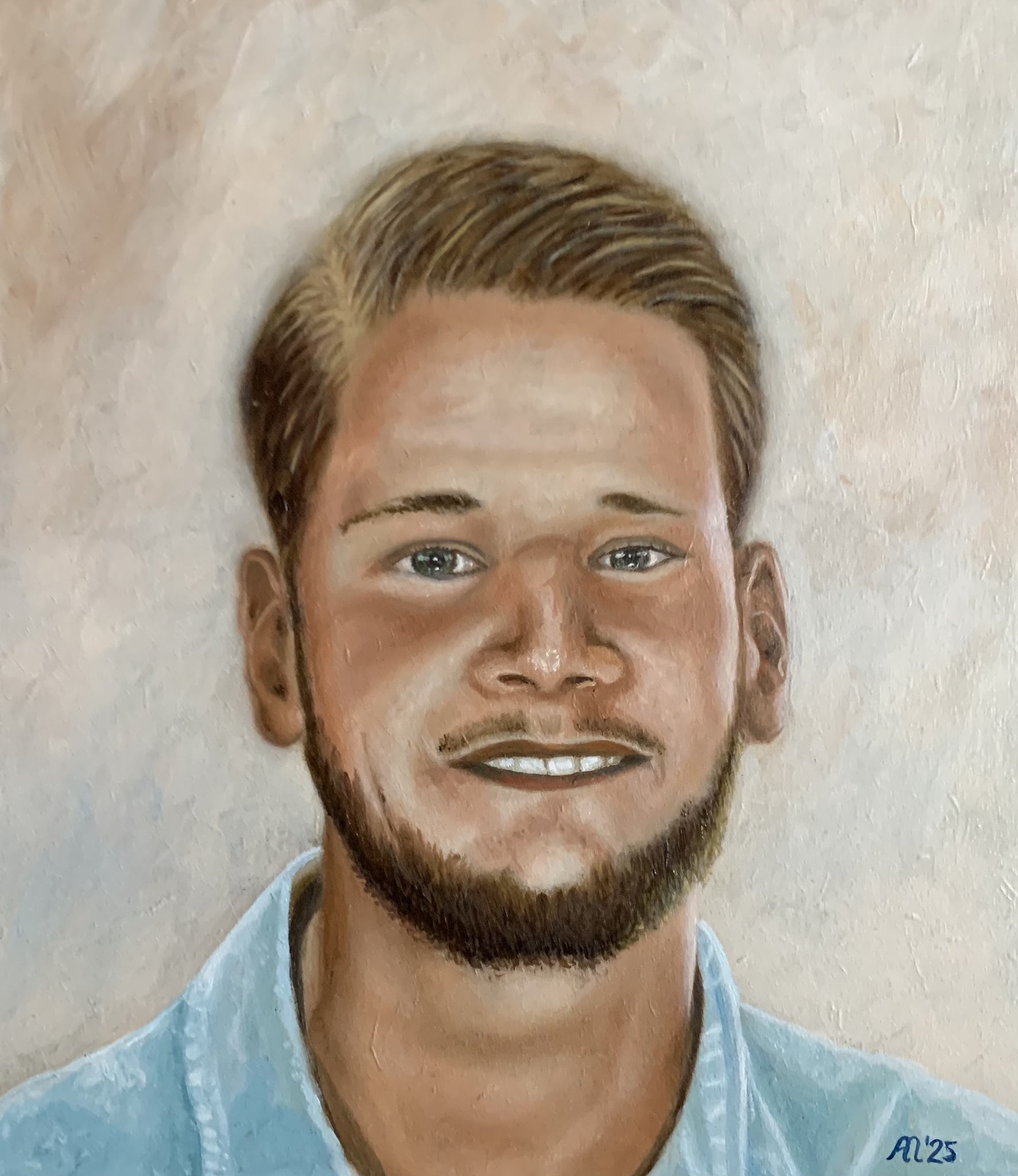 Krachtig portret van jonge man gemaakt met olieverf op MDF paneel, met aandacht voor licht, huidtonen en karaktervolle expressie.