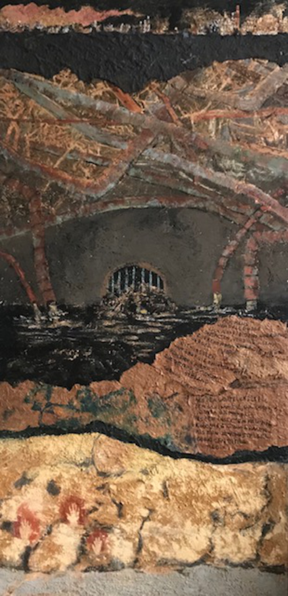 Afbeelding van handafdruk met oker op de rotswand van een grot, onderaan, bovenaan onze tijd; met zoeken naar energie, buizen die ondergronds gaan, rokende schoorstenen.