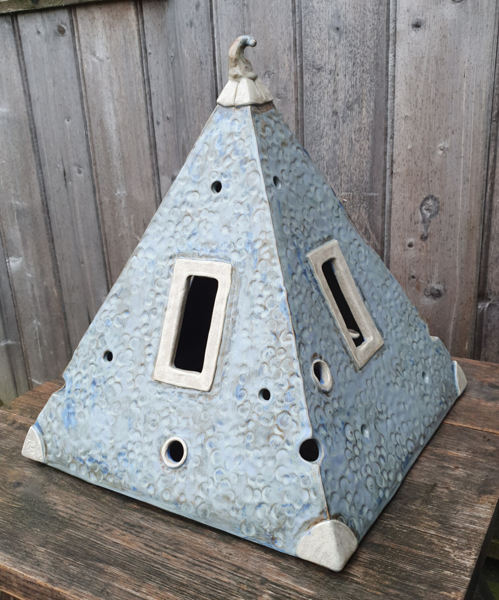 vrij bouwsel toren met doorkijkjes, kan evt. een kaars in geplaatst worden, steengoed, kleuren: diverse blauw , grijs en wittinten