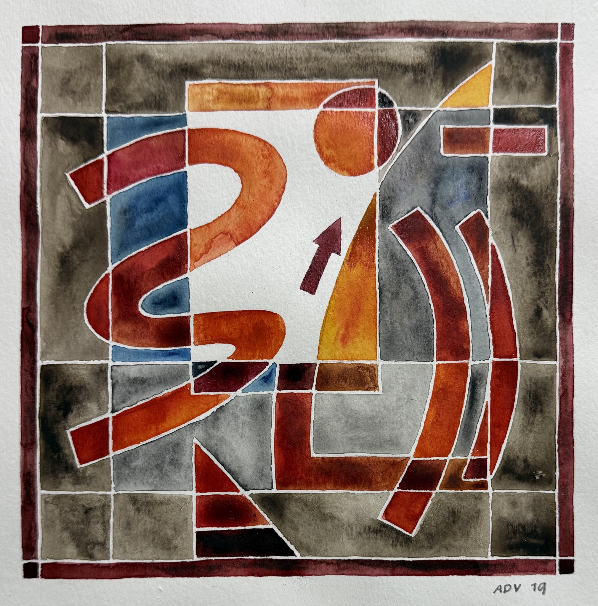 Compositie met penseel, waterverf op aquarelpapier. De witte lijnen en het witte vlak zijn vrijgehouden (= niet beschilderd).
