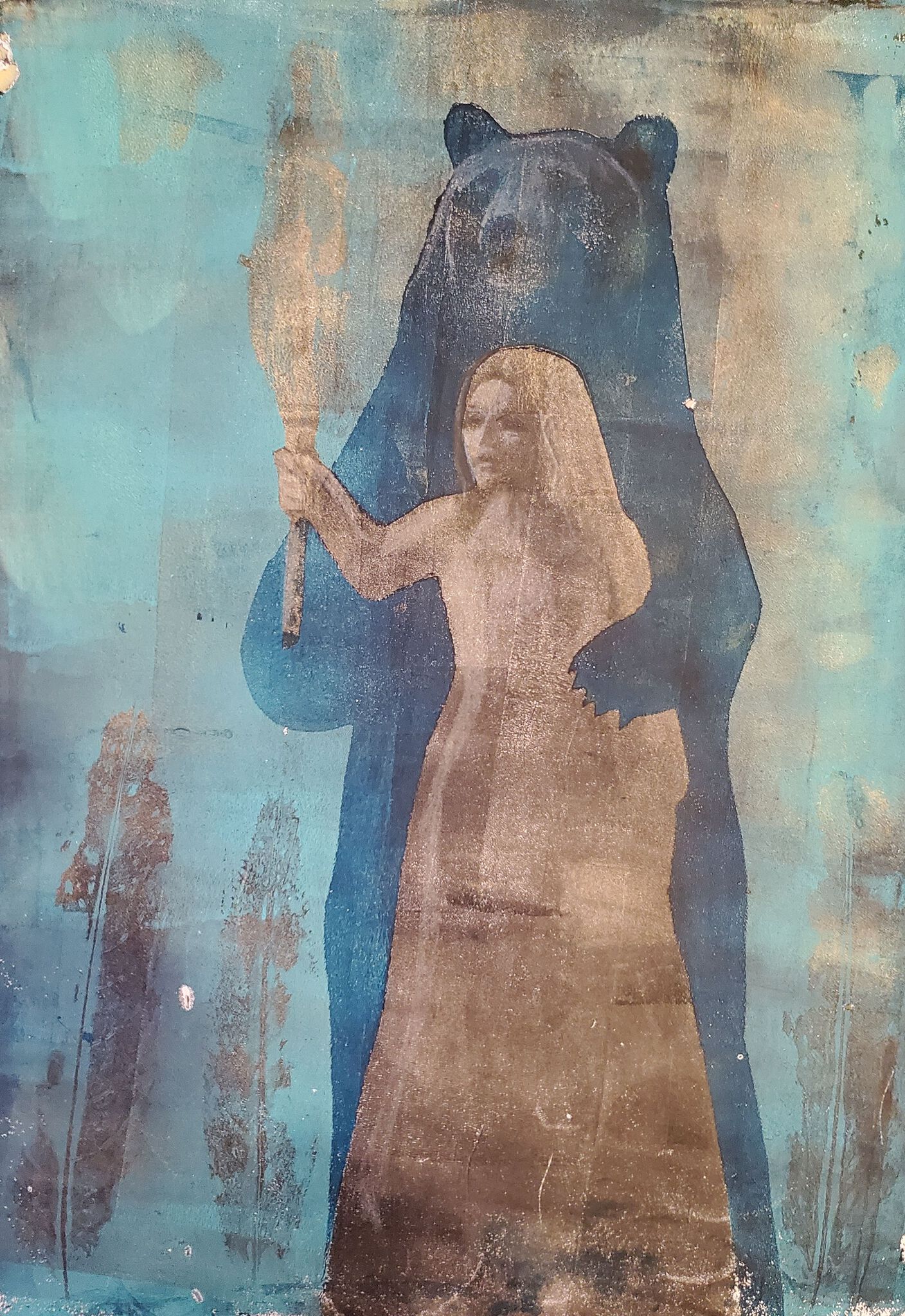 Gelliplate Druktechniek Beer Krachtdier Beschermer Vrouw Fakkel