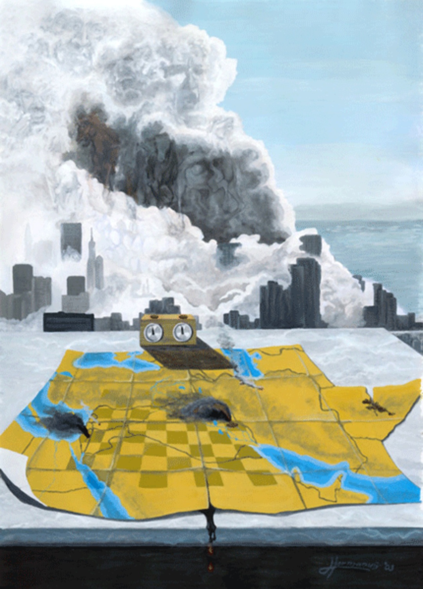 Kaart Doodskop Towers Bijbels Bush Apocalyps Schaakbord Powell 9/11 Midden-oosten Horsemen Rumsfeld Cheney Schaakklok