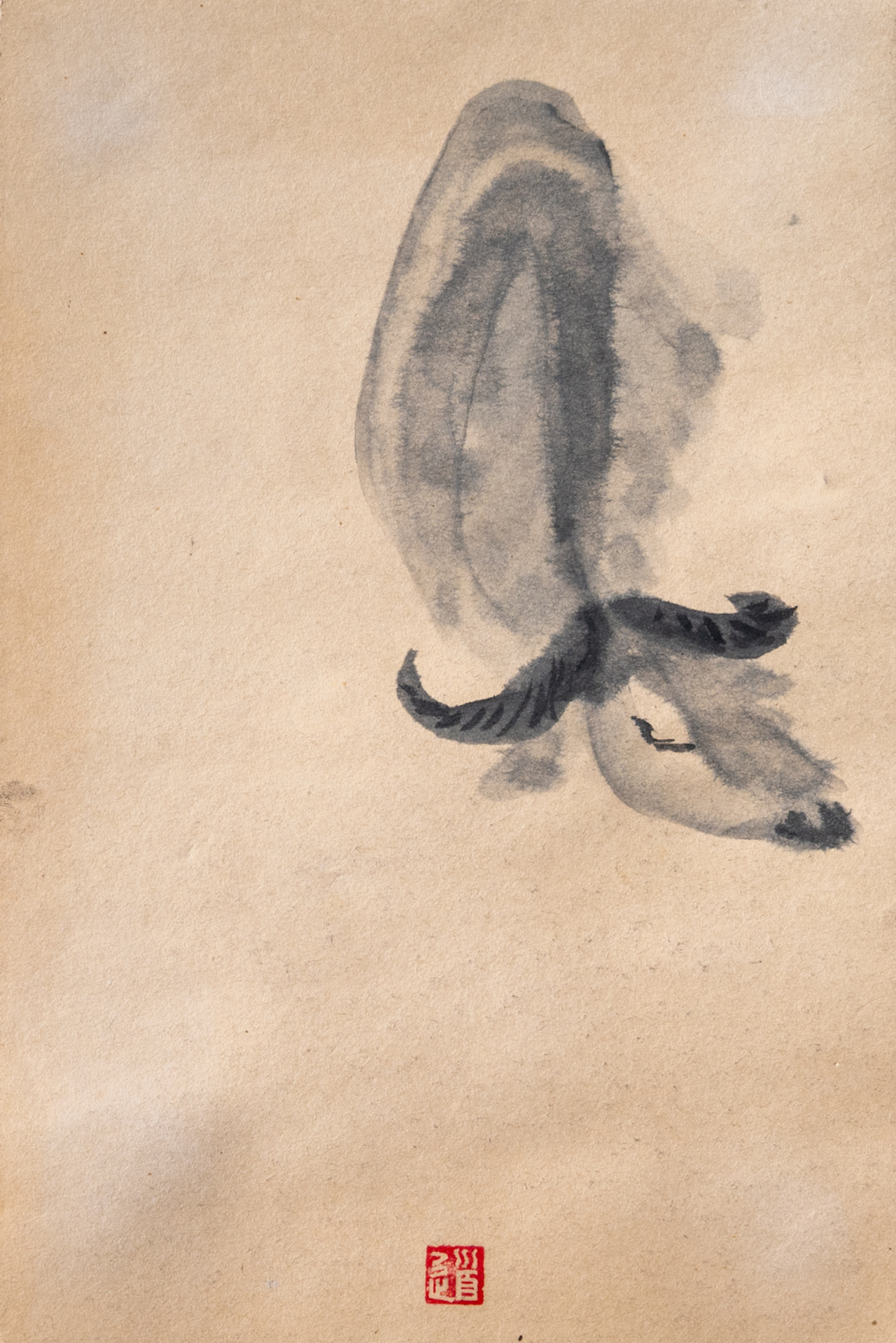 Badende waterbuffel, zwarte inkt op bruin papier.