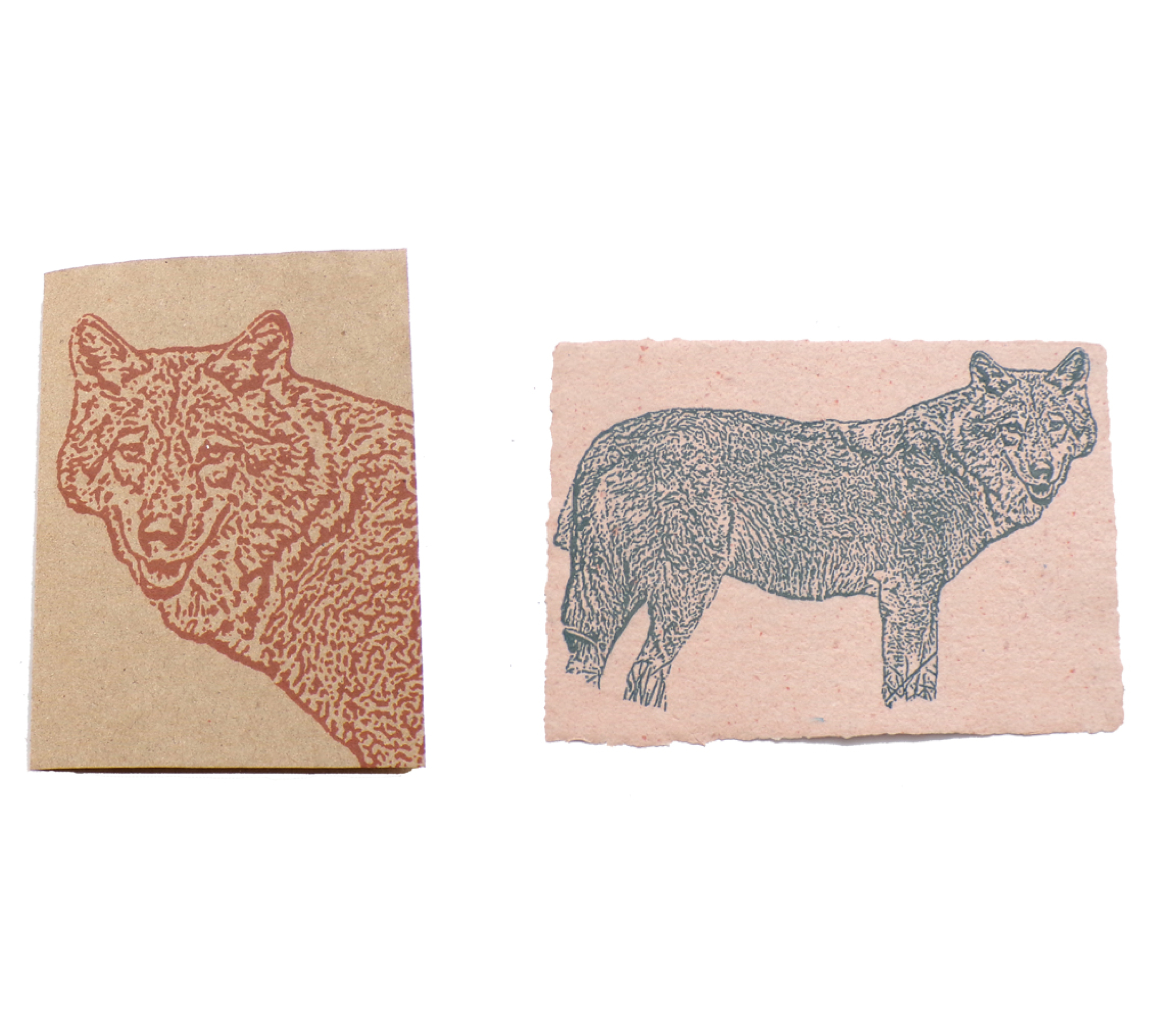 Experiment waarin ik de wolf laat terugkeren op verschillende formaten en verschillende ondergronden; op de voorkant van een boek, op handgeschept papier, een papieren zak, enz