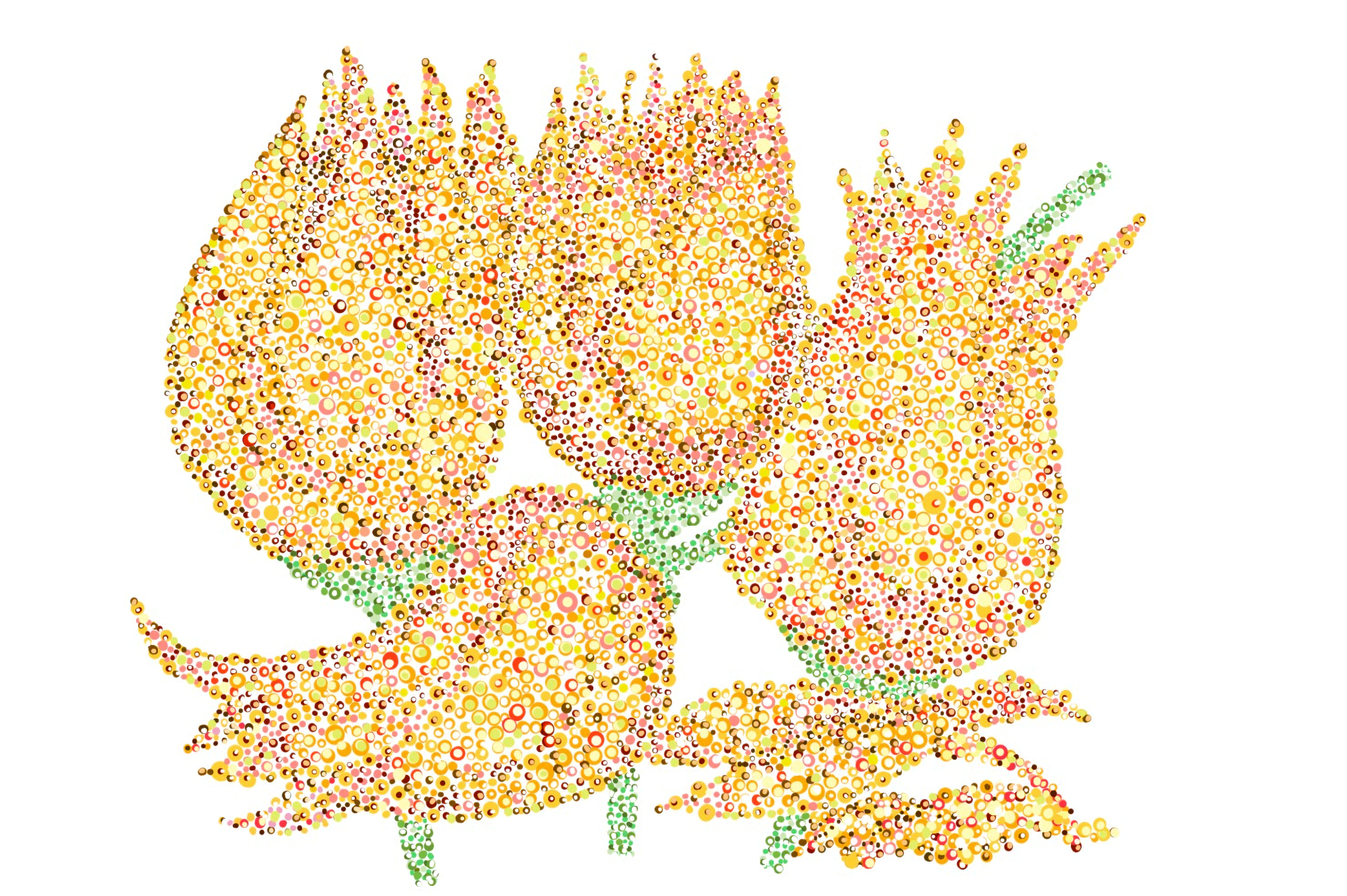 De kunstenaar is geïnspireerd door de kunststroming Pointillisme. Door op de kleuren afwisselend stippen en lijnen aan te brengen, creëert Studio Spanjersberg een harmonisch geheel.