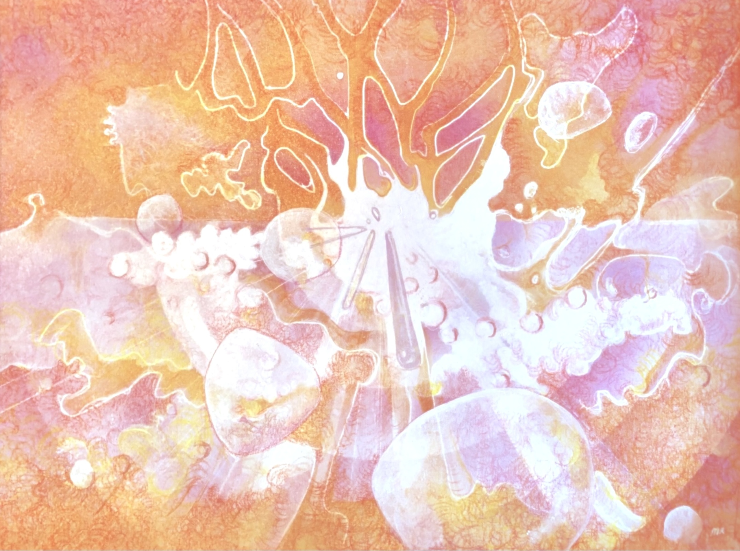 In Rust in beweging vloeien lagen van potlood, acryl en pen in elkaar over tot een organisch landschap. De tekening ademt verstilling, maar leeft subtiel onder het oppervlak—alsof elke lijn, vorm en textuur een stille beweging draagt. De materialen bouwen samen een gelaagde wereld waar aarde, natuur en innerlijke rust met elkaar in verbinding staan. Het geheel is ingelijst met een museum-passepartout wit formaat 24 x 30 cm.