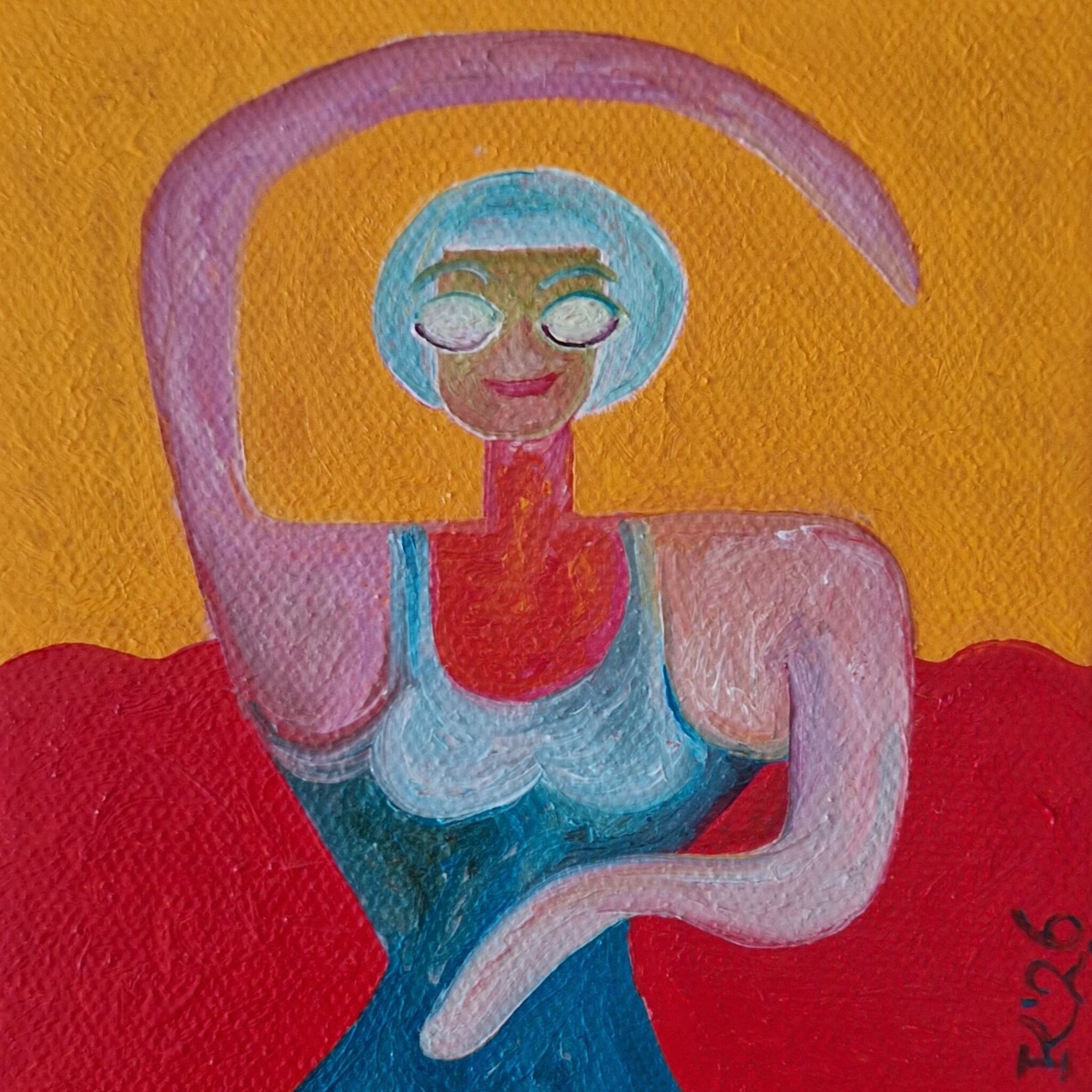 Olieverf op katoen, 10 bij 10 cm, voorzien van haakjes en draad aan de achterkant, zodat je het schilderijtje makkelijk op kunt hangen. Pictoright. Vanaf tweede helft mei 2026 te koop voor 125 euro. Als je je aanmeldt voor mijn nieuwsbrief, zie linksonder bij 'contact', krijg je 10% korting bij aanschaf van dit werk. De prijs is exclusief verzendkosten.