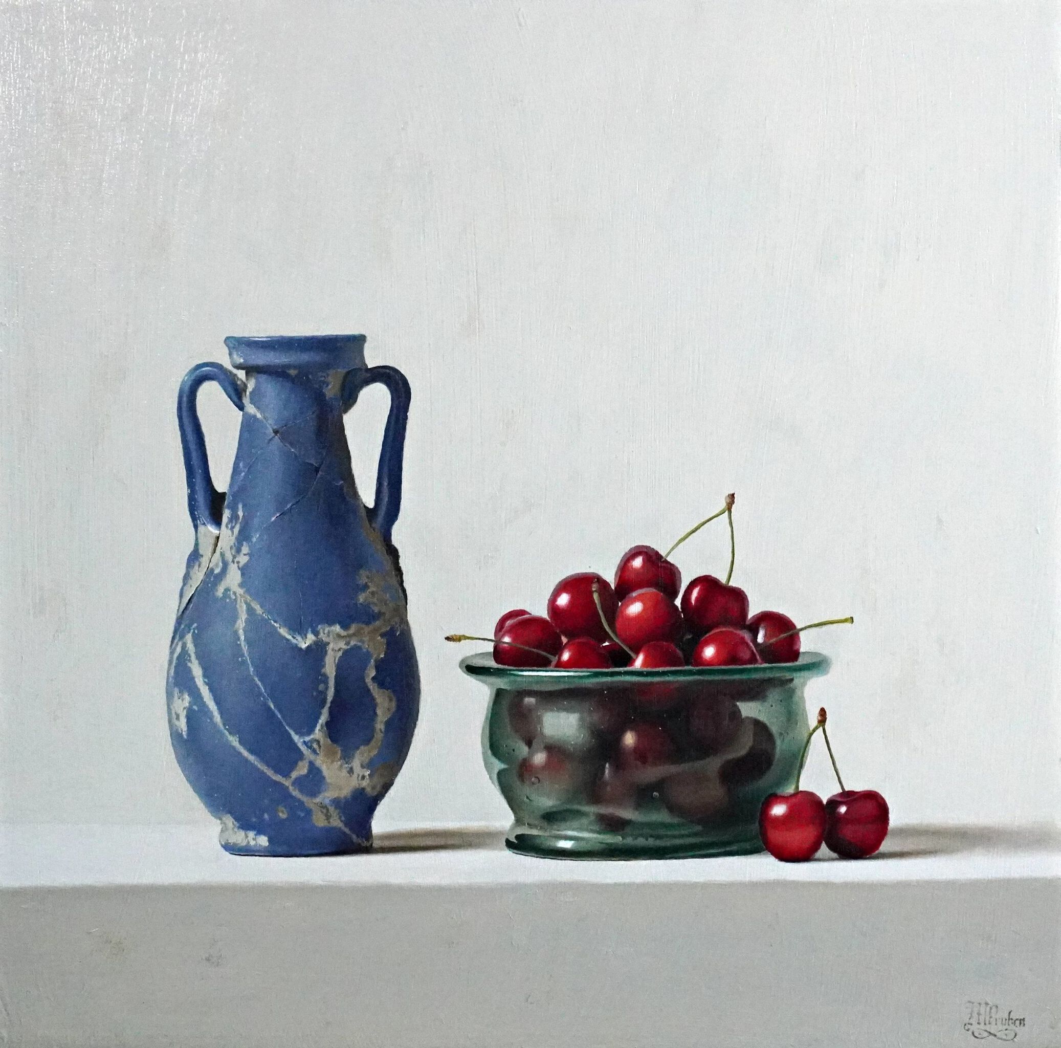Een ingetogen stilleven ontvouwt zich tegen een zachte, bijna ademende achtergrond. Links staat een verweerde blauwe kruik, haar oppervlak dooraderd met lichte breuklijnen en slijtage, als sporen van tijd en gebruik. De matte huid van het object vangt het licht op een sobere, eerlijke manier—zonder glans, maar met karakter. Daarnaast rust een lage, groen getinte glazen schaal, licht transparant, waarin een verzameling rijpe kersen ligt opgestapeld. Hun diepe rood contrasteert krachtig met de koele tonen van het glas en de kruik. Het licht speelt subtiel door het glas heen, waardoor de vormen binnenin vervagen en zich vermengen tot een zachte schaduwpartij. Enkele kersen liggen los op de tafel, als een klein, haast terloops gebaar dat de compositie openbreekt. Hun steeltjes wijzen in verschillende richtingen, wat een gevoel van spontaniteit toevoegt aan de verder gecontroleerde opstelling. Het licht komt van links en valt zacht over de objecten, waardoor een rustige overgang ontstaat tussen licht en schaduw. De tafel en achtergrond blijven bewust sober en stil, waardoor alle aandacht naar vorm, kleur en materie wordt geleid. Het geheel ademt rust, vergankelijkheid en aandacht—alsof elk object even stilgezet is in de tijd.