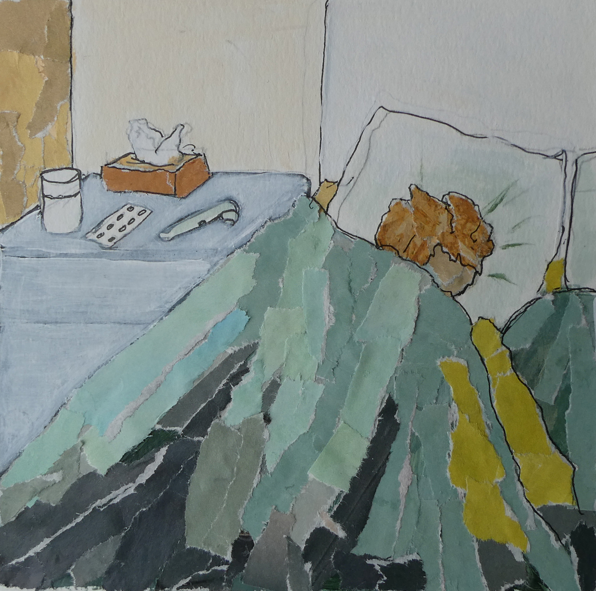 Slapen, slapen, slapen. Werk op papier in mixed media: inkt, acryl en collage van gescheurd papier.