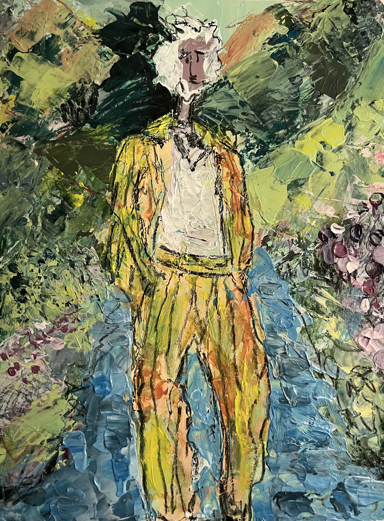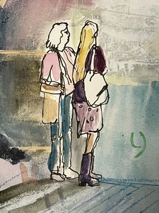 Op een vrolijke, kleurrijke en speelse manier teken ik vooral mensen in hun omgeving. Mixmedia.