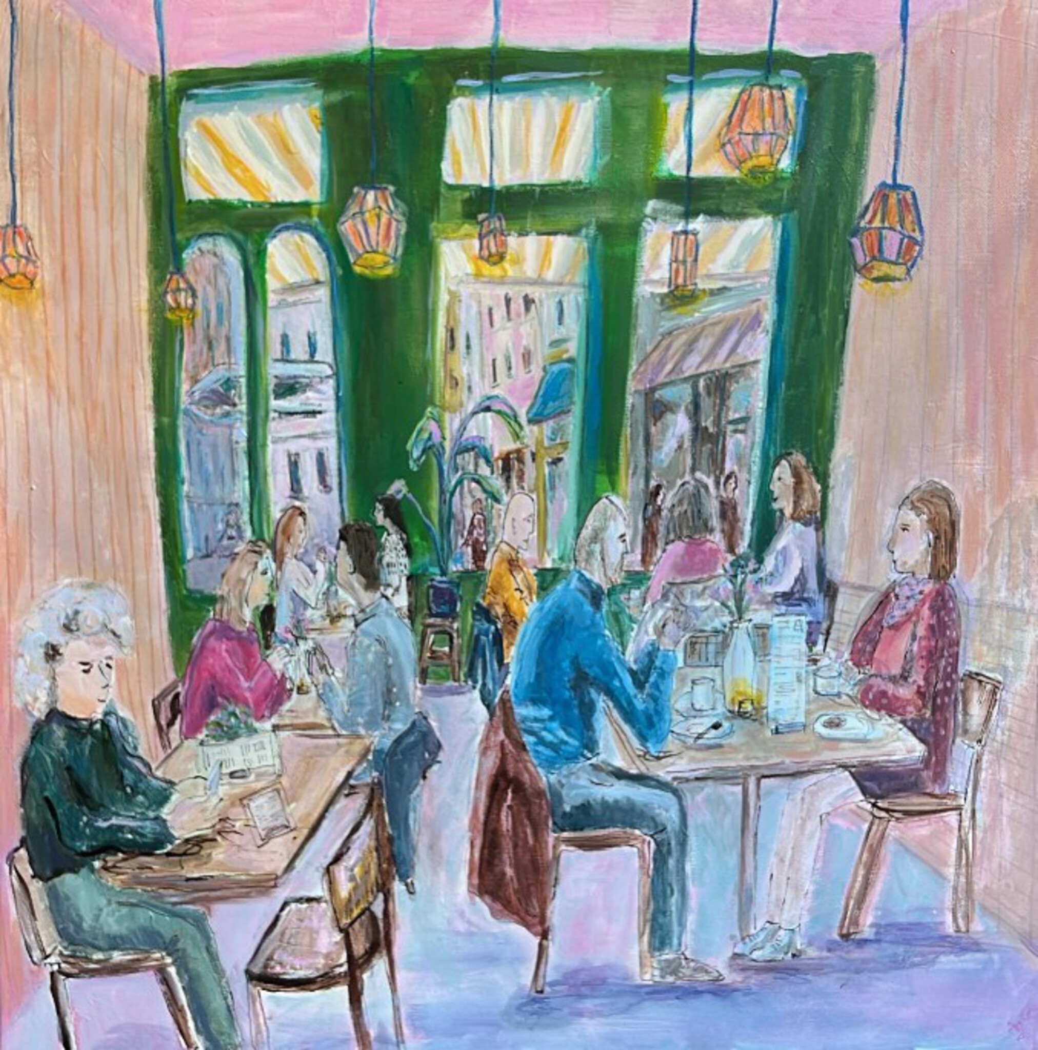 Op een vrolijke, kleurrijke en speelse manier teken ik vooral mensen in hun omgeving. Mixmedia.