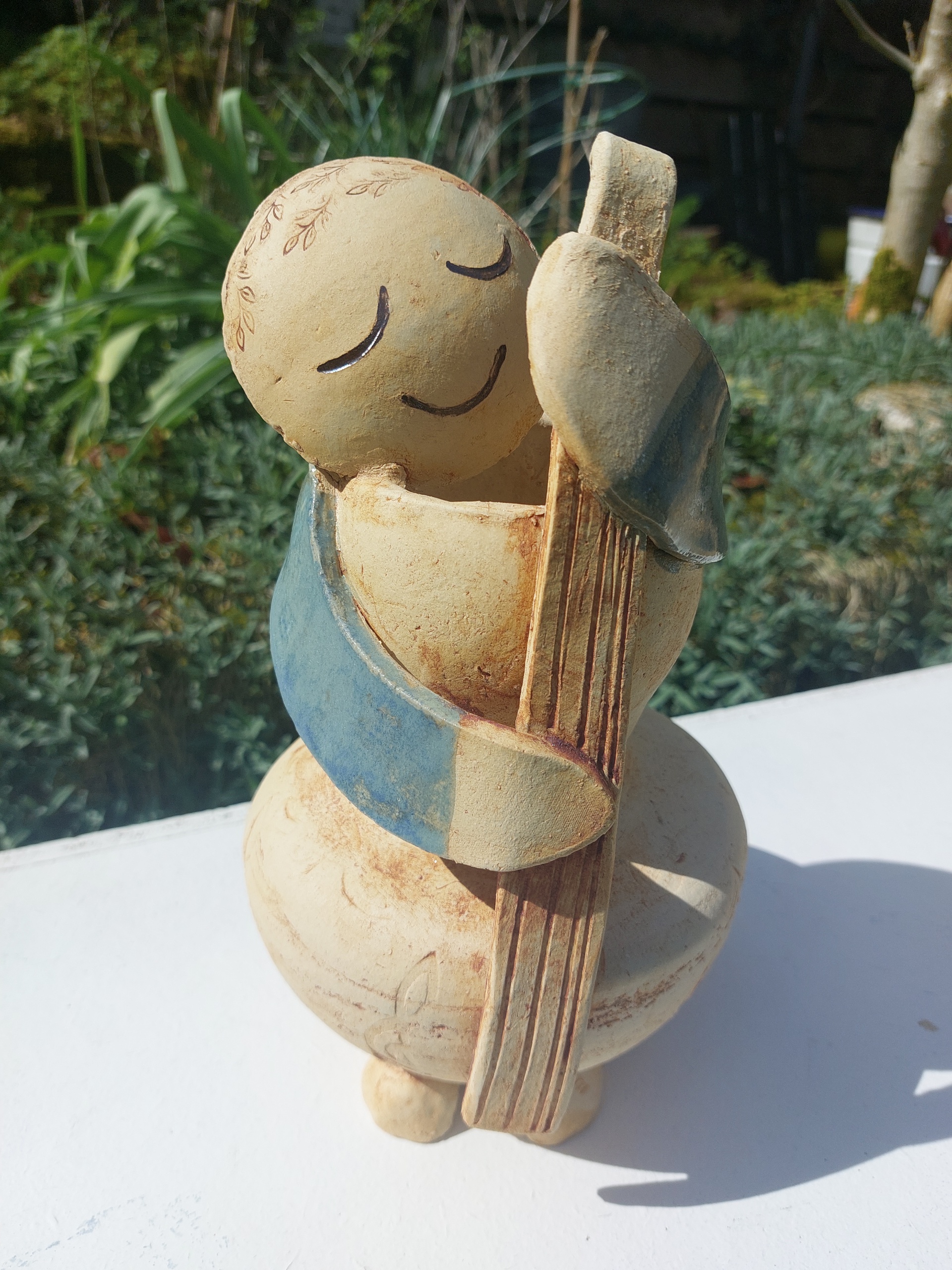 Contrabasspeler die onderdeel is van een serie muzikanten. Met oxides en glazuur.