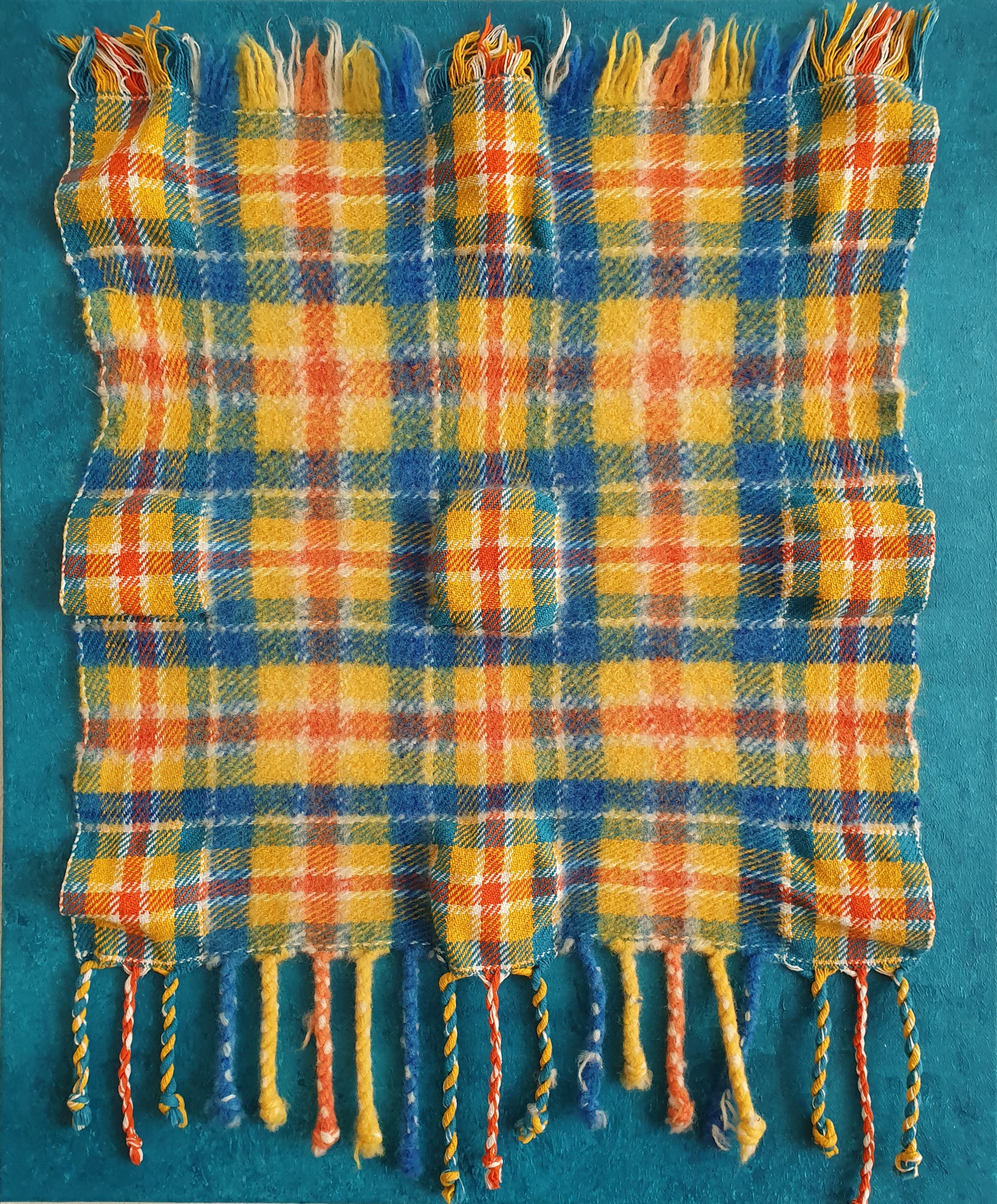 persoonlijke tartan, een schotse ruit, gebaseerd op de naam 'anneke' a=1 draad, n=14 e=5 k=11 draden, met cottolin en wol dat gevilt is