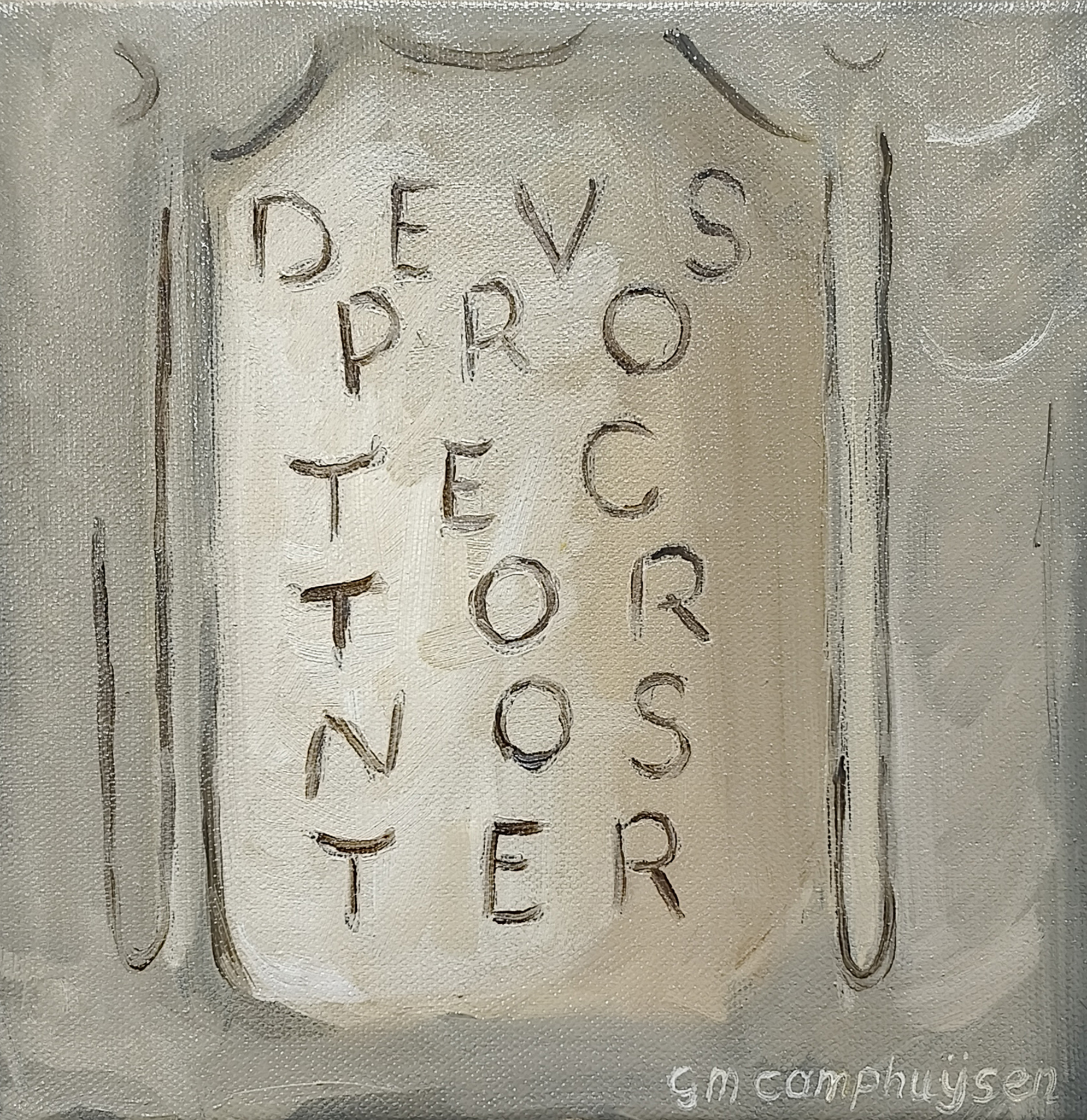 Toen ik werkte aan de Tré Kronos onderzocht is alle details goed. Zo ook ontdekte ik latijnse tekst op de gevel van het paleis en kwam tot de ontdekking dat er geschreven stond "Deos Protector nos (ter) dat laatste deel zou achter het huis je moeten staan. Govert nam voor veel details veel moeite het op te nemen in het beeld van het straat leven van het oude Stockholm. En stammend uit een diep gelovig gezin vestigde hij ook aandacht op de religieuse op roep: "God bescherm ons" En tekst, die leerde ik, in de 17e eeuw op veel oude belangrijke gebouwen stond als ook op wapen schilden. Voor een mini expositie rond de paasdagen waar ik uitgenodigd was bij te dragen onder het thema Kirië eleison, besloot ik inzoomend de tekst te schilderen in die 17e eeuwse stijl.
