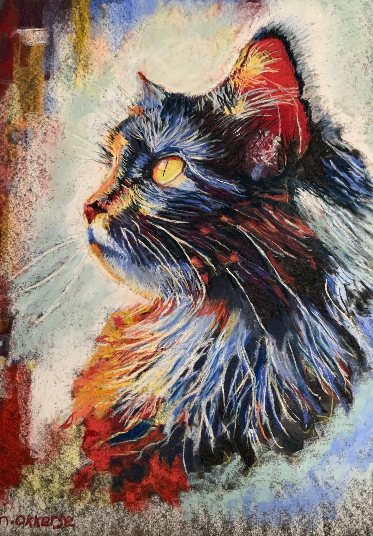 In dit kleurrijke en expressieve portret staat de kat centraal als stille observator. De felle, contrasterende kleuren brengen niet alleen het dier tot leven, maar benadrukken ook zijn scherpe zintuigen en alerte houding. De blik, gericht op iets buiten beeld, roept een gevoel van spanning en nieuwsgierigheid op — alsof er elk moment iets kan gebeuren. Door het gebruik van losse, energieke penseelstreken ontstaat er beweging en diepte, terwijl het licht subtiel over de vacht speelt. Dit werk balanceert tussen realisme en expressie en vangt daarmee niet alleen het uiterlijk van de kat, maar ook zijn karakter: onafhankelijk, mysterieus en intens aanwezig.