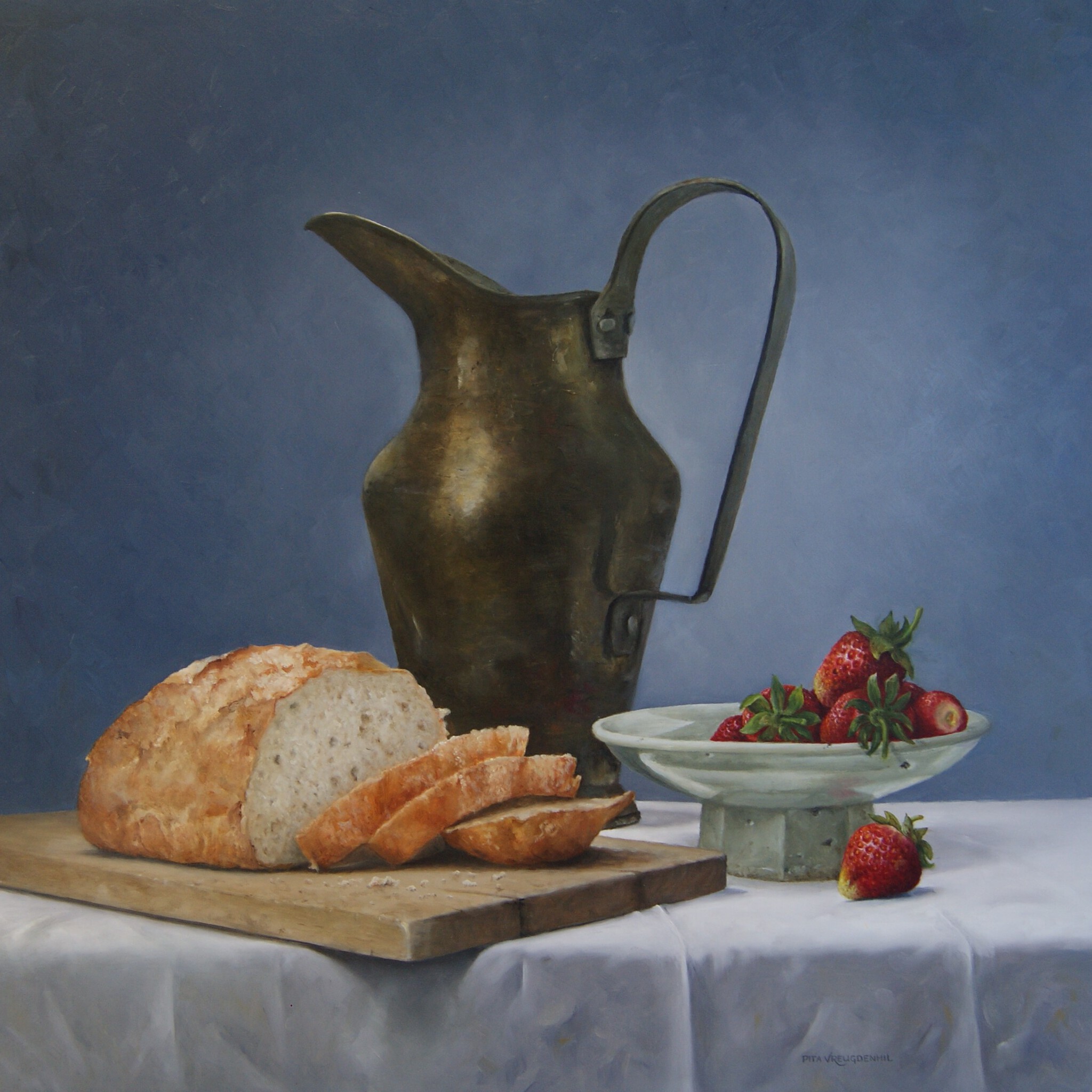 Stilleven Olieverf Paneel Realisme Realistisch Art Tekoop Ingelijst Brood Plank Aardbeien Celadon Schaaltje Water Kan Wit Laken