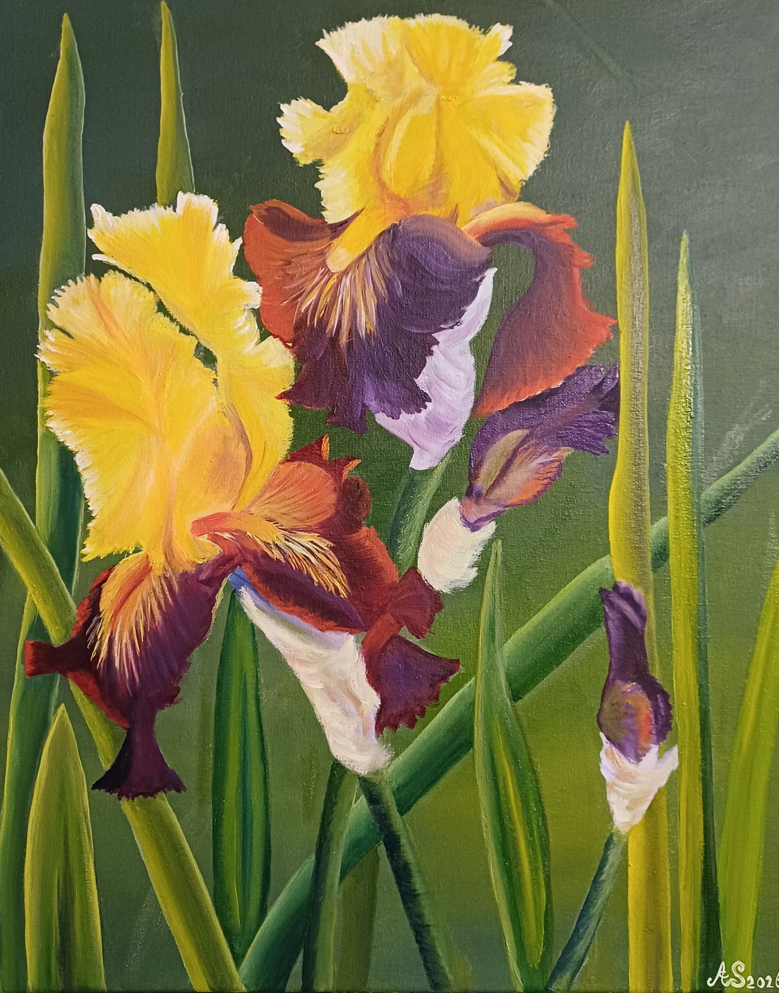 Dit schilderij is de laatste uit de serie van vier Baardirissen. De Baardiris kenmerkt zich door een harig vaak gelig "baardje" op de kelkbladeren. De meeste soorten stammen uit Europa. De drie bloemblaadjes worden vaak geassocieerd met wijsheid, moed en geloof. Ik heb met veel plezier aan deze serie gewerkt en genoten van de verschillende vormen en kleuren die er zijn binnen één soort bloem.