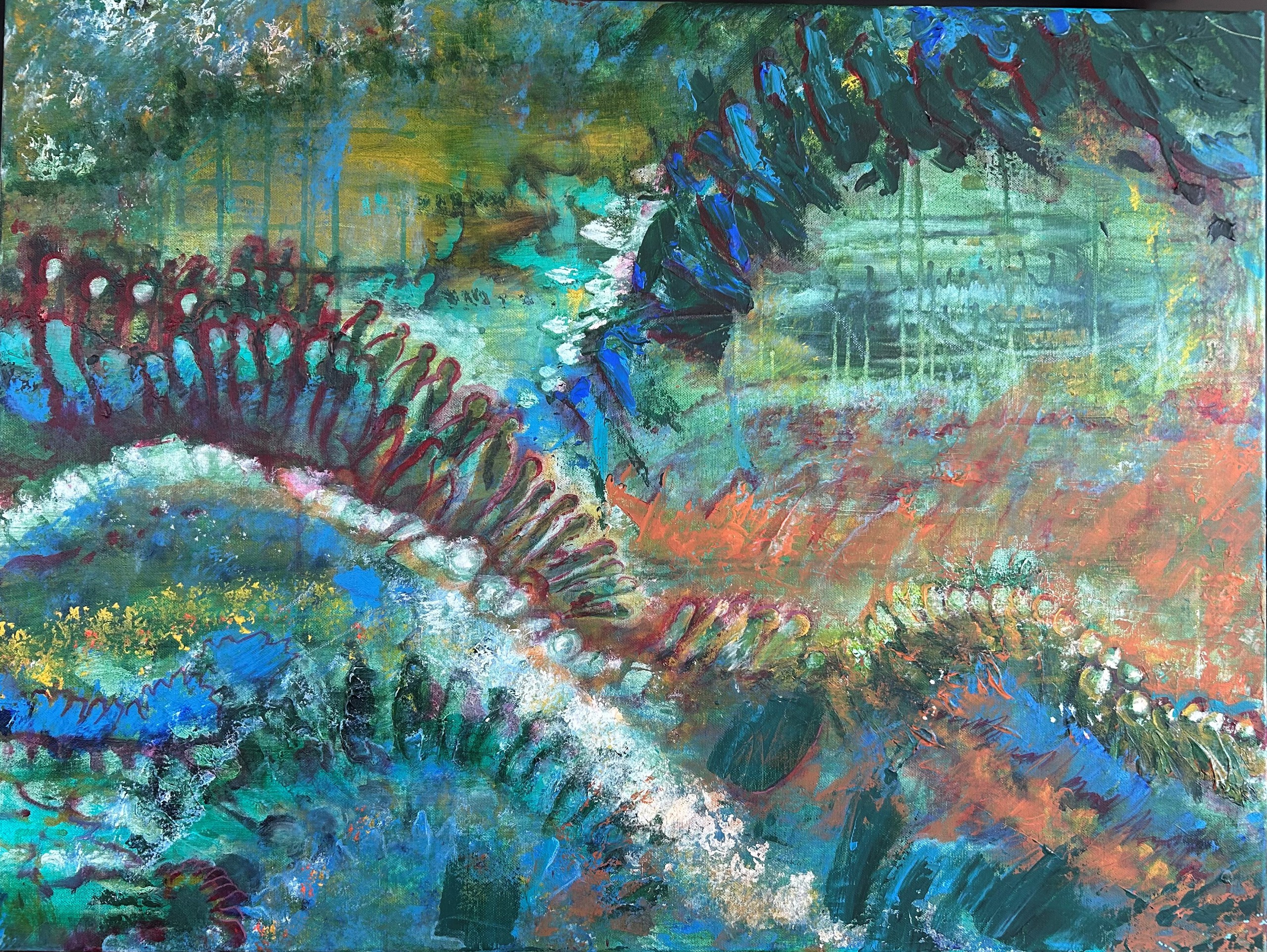 Kleurig werk waarin mensen te zien zijn en ook iets van wervels in een landschap geplaatst.