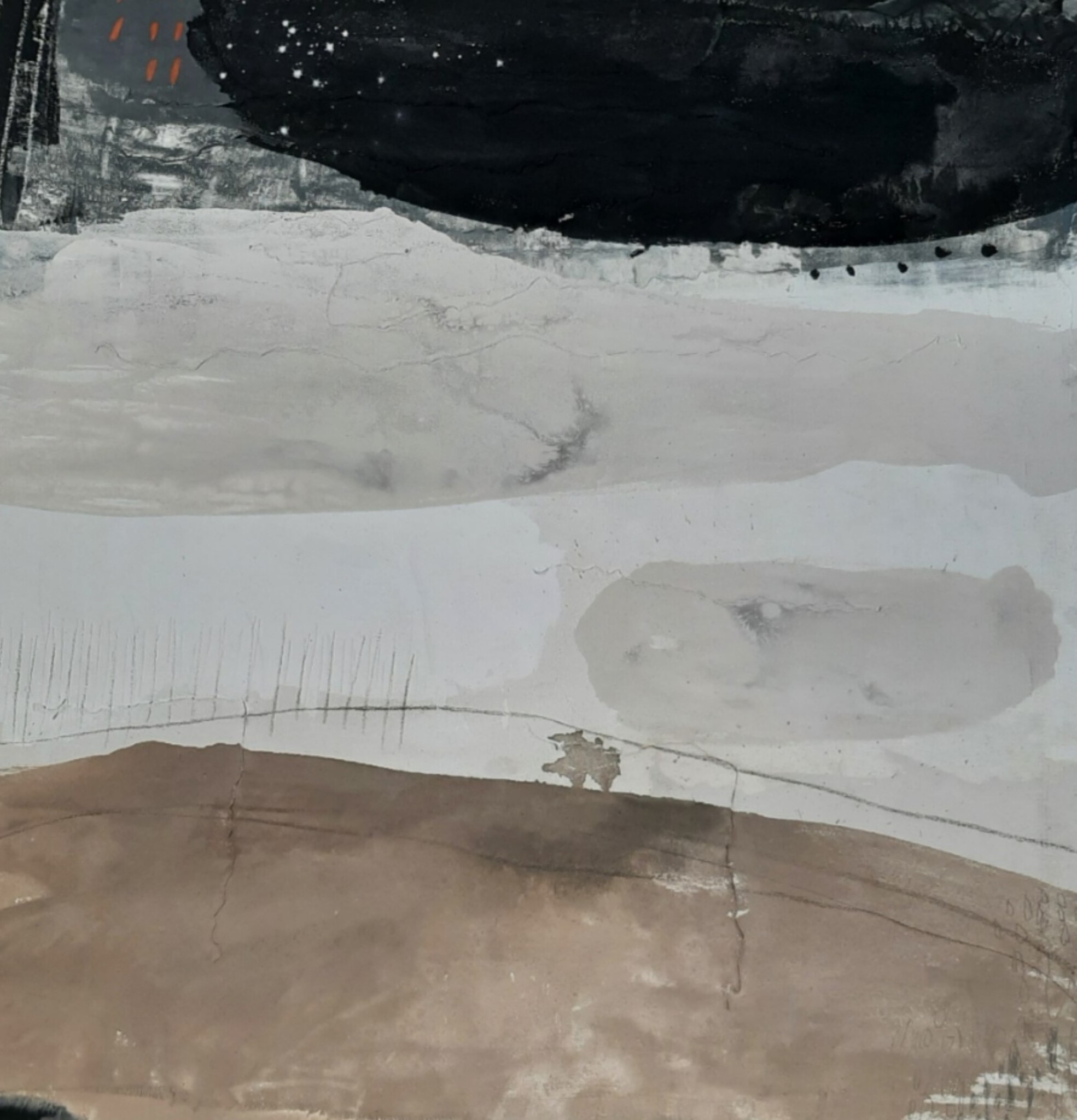 landschappen. Poëtisch maar ook vervreemdend. Met humor en onverwachte wendingen. De kern van de compositie wordt gevormd door grote vormen met een krachtige uitstraling , toegevoegd worden kleine details waardoor je al lopend door het schilderlandschap stuit op onverwachte ontdekkingen.