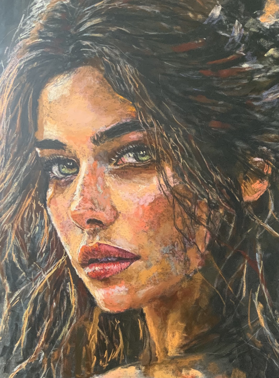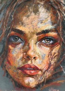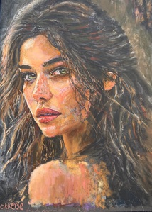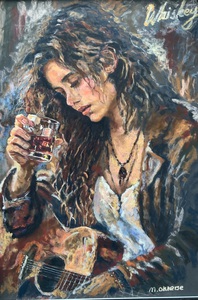 In dit expressieve portret vangt Martin G Okkerse een intiem moment van rust en reflectie. De vrouw, verdiept in haar gedachten, houdt een glas in haar hand terwijl de gitaar nog zacht de echo van muziek lijkt vast te houden. Het werk ademt een sfeer van melancholie, kracht en kwetsbaarheid. De losse, gelaagde opbouw met soft pastel geeft het schilderij een rauwe en levendige uitstraling. Warme tinten van rood, bruin en oker worden afgewisseld met lichtere accenten, waardoor diepte en beweging ontstaan. De combinatie van muziek en emotie maakt dit werk herkenbaar en intens. Een krachtig kunstwerk dat niet alleen een moment toont, maar een verhaal vertelt.
