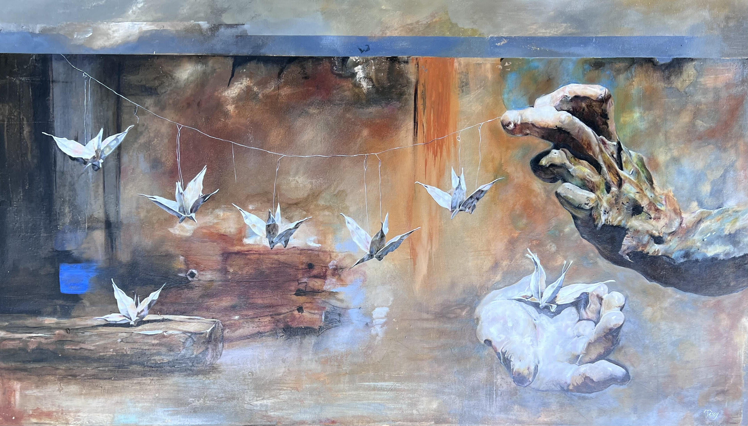 Papieren kraanvogels zweven tussen spanning en overgave, gedragen door draden die tegelijk verbinden en ondersteunen. Er ontstaat een ruimte waarin kwetsbaarheid wordt gedragen. Een sugestie dat echte geborgenheid kan schuilen in de fijne verbindingen die ons opvangen.