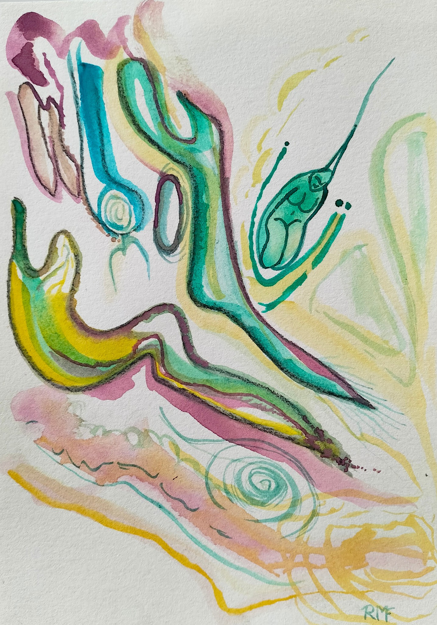 Figuratieve kleurrijke schilderijen met aquarel of olieverf. onderwerpen uit natuur zoals vogels. Neigt naar abstractie door intuïtieve werkwijze. Ook mixed media en kleine en grote installaties.