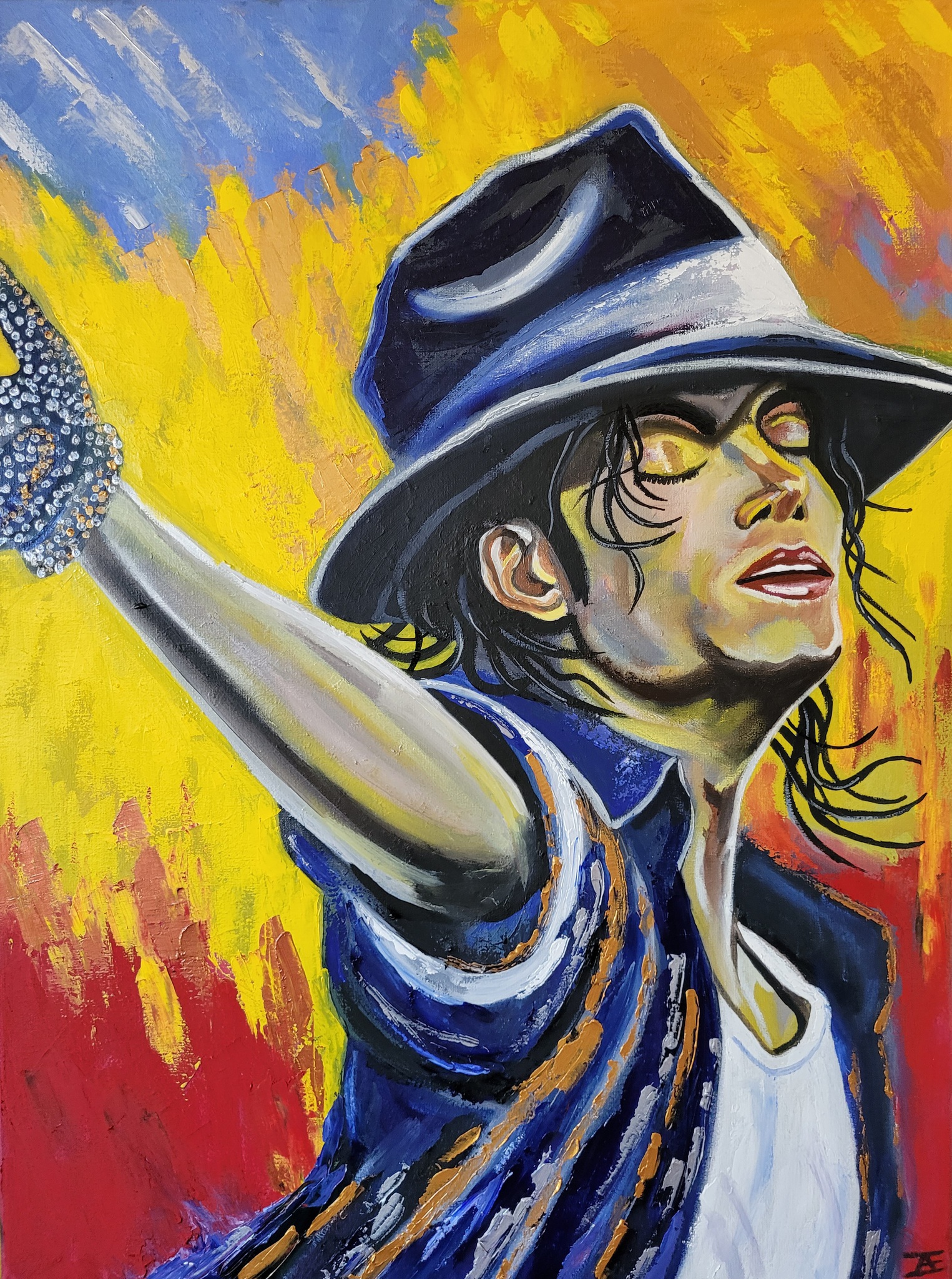 Een kleurrijk schilderij van Michael Jackson.