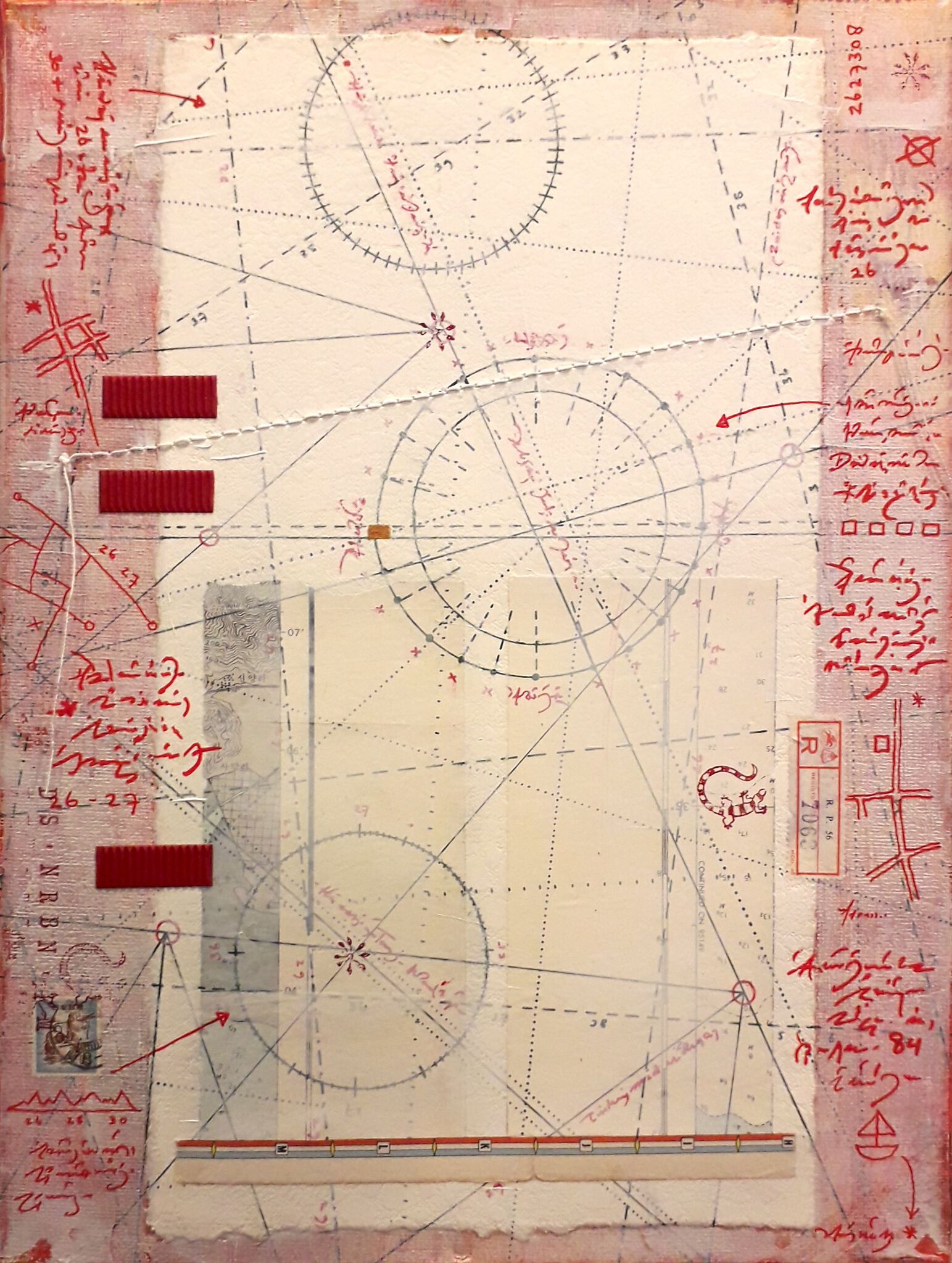 Imaginaire landkaart. Mixed media op doek. Ingelijst in baklijst.