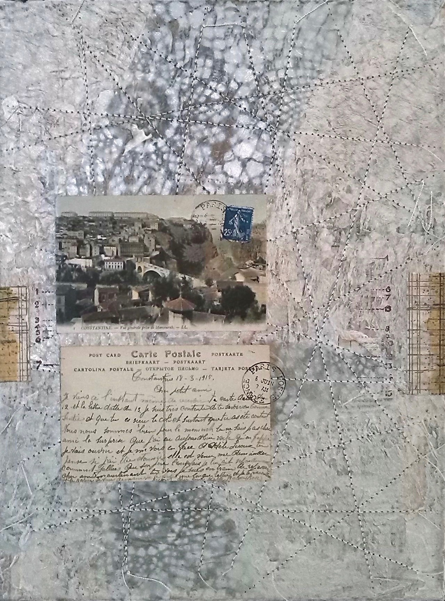Imaginare landkaart. Mixed media en burduurwerk op canvas. Ingelijst in baklijst.