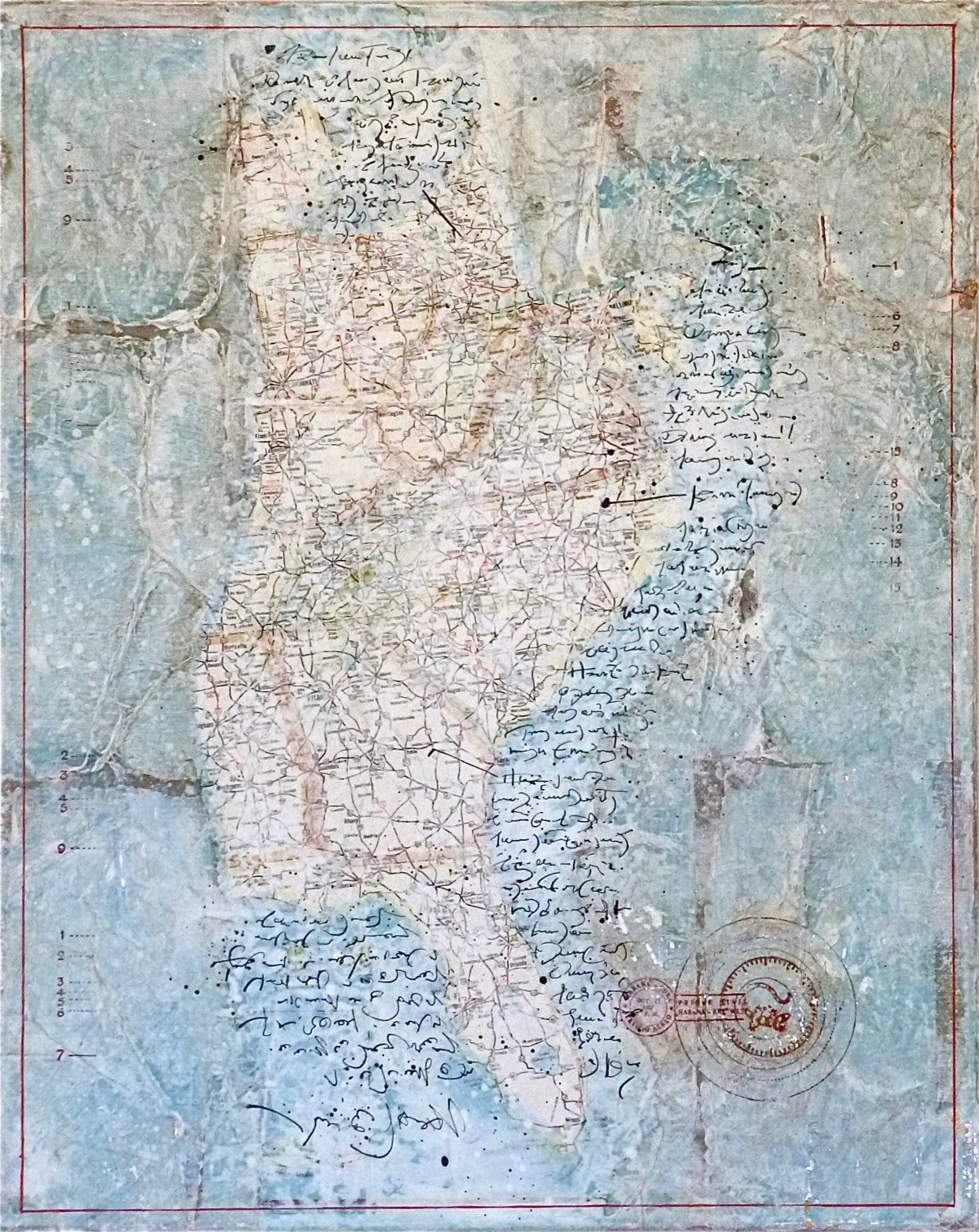 Imaginaire landkaart. Mixed media op doek. ingelijst in baklijst.