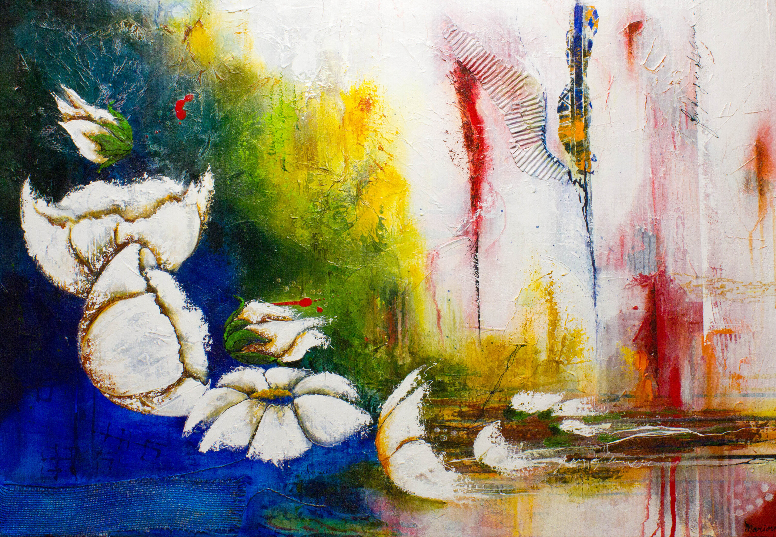 Reconnection is geschilderd met Acryl op canvas doek. Tevens hierin verwerkt een collage van vloeipapier, Jutte, Ribbelkarton en Acrylinkt. Afmeting 100 x 70 (B/H) in zwarte baklijst.