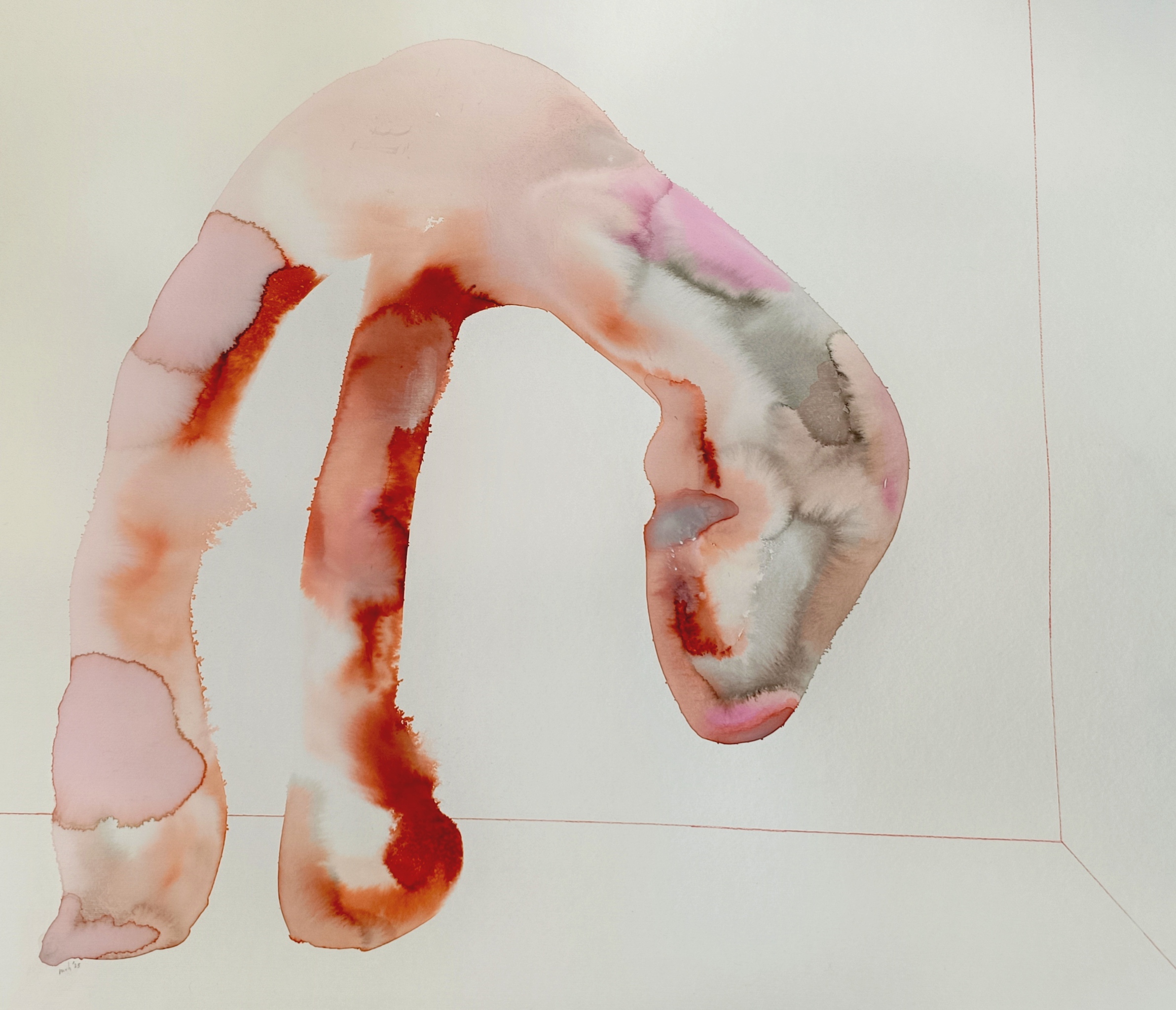 Roze droefsnoet gaat hoek in, inkt en water op papier