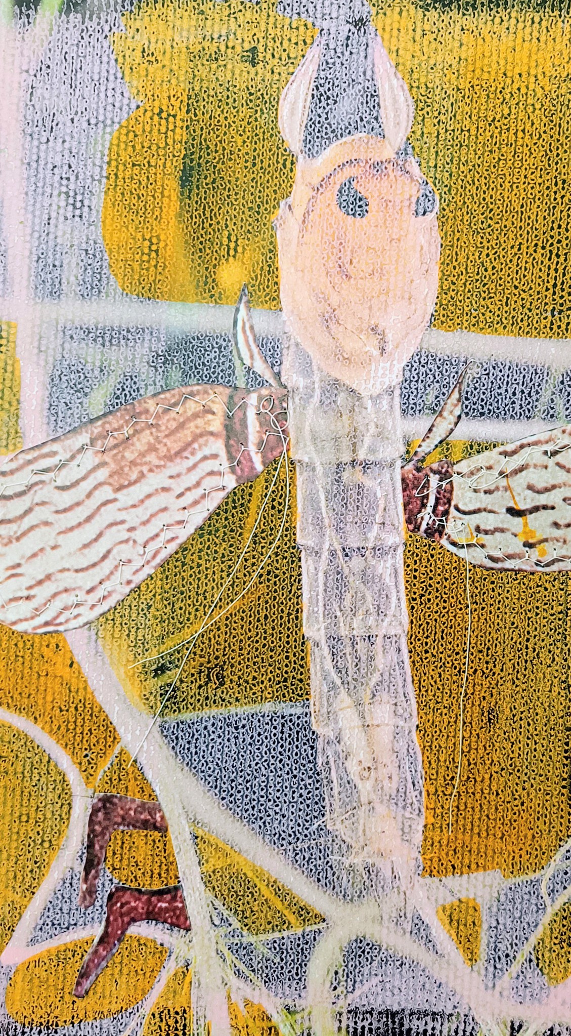 Collage, pluimmug, geel, voetjes en vleugels, genaaid