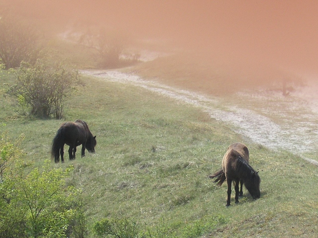 Van het ene moment op het andere kwam er een roze/rood nevel over deze paarden.