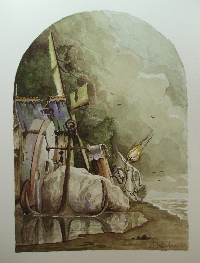 Molen Zee Landschap Bomen Kaars Vogels Anker Realisme Fantasie Romantiek Papier Aquarel