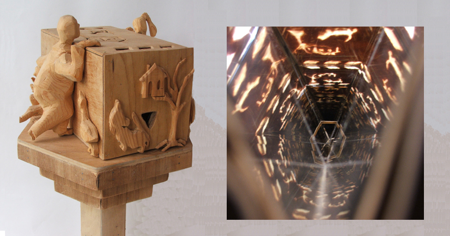 De kijkdoos toont in zijn buitenkant een wereld van menig gezinnetje in houtsnijwerk. De binnenkant is een feest van licht en vorm.