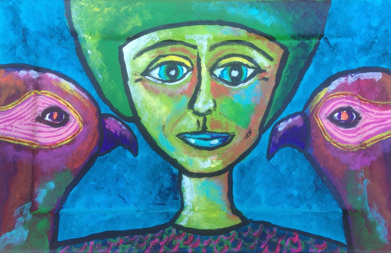 Vrouw tussen twee vogels