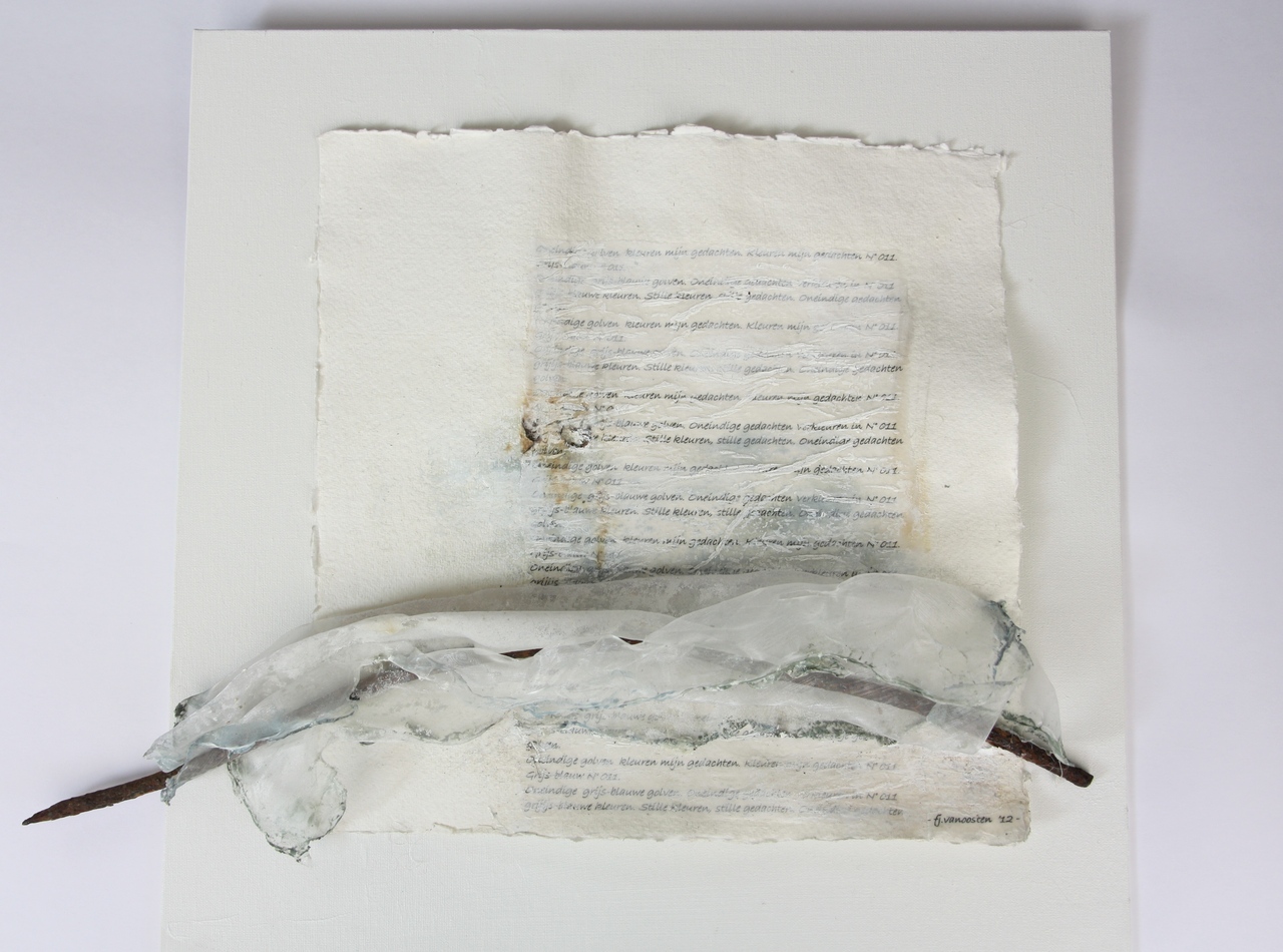 Ik vang in mijn werk momenten van rust en harmonie die ik vind aan de kustlijn. Hiervoor gebruik ik blauwgrijze, ziltgroene en natureltinten en eigen teksten die ritmisch terugkomen, over de golfslag en de oneindigheid van de zee. De non-figuratieve objecten zijn 2-dimensionaal met een sterk reliëf, in gemengde technieken als: schilderen, snijden, branden, naaien, smelten. De materialen bestaan o.a. uit acryl- en aquarelverf, schelpen, drijfhout, roest, zand, voile, en bedrukt papier.